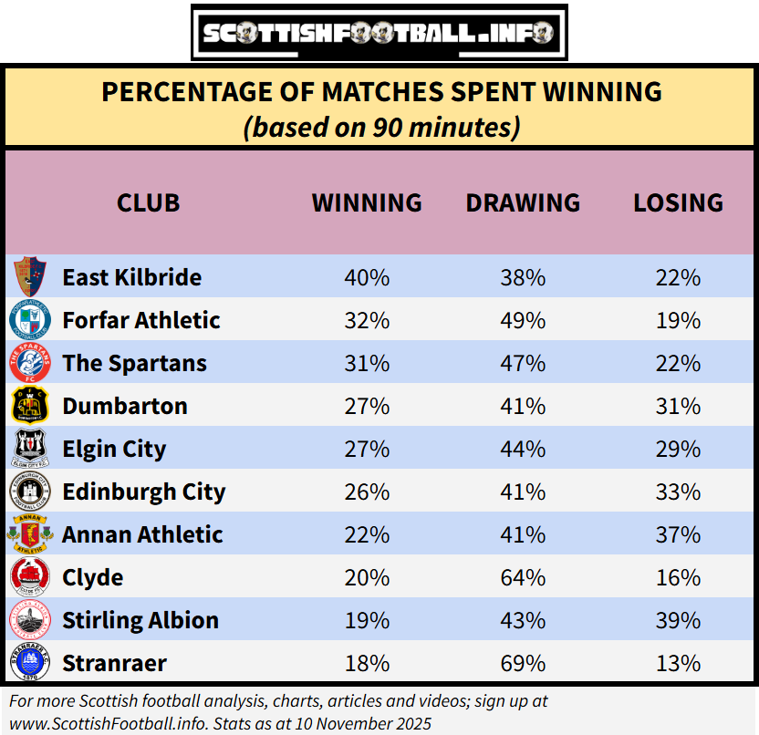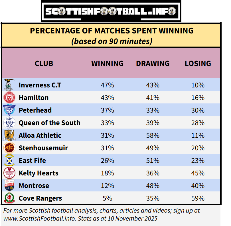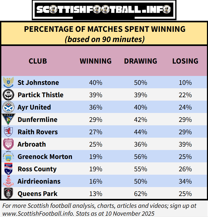 This table shows the proportion of total match time each team has spent in a winning position this season. St Johnstone have only been losing for just 10% of the minutes played, while Queen’s Park have been leading for only 13% of matches.
