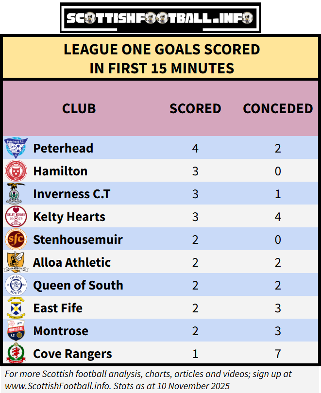 Games involving Peterhead and Kelty Hearts have some the most entertaining starts, with 6 and 7 goals in the opening 15 minutes respectively. Cove Rangers start their matches abysmally, scoring once yet conceding 7 times in the opening 15 minutes.
