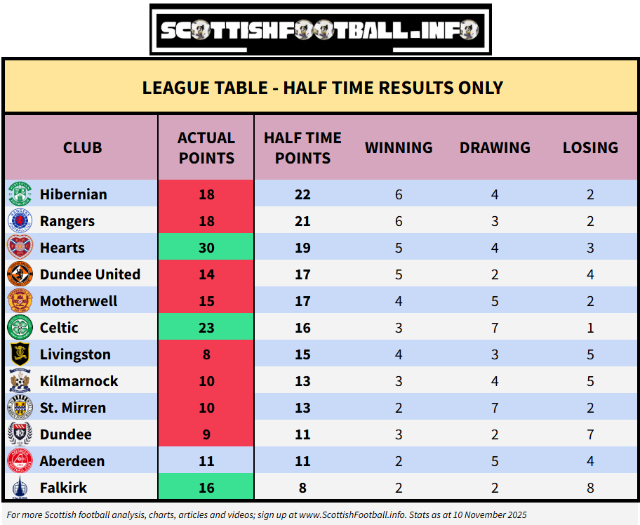 Only Hearts, Celtic and Falkirk are on a higher number of points than they had ‘earned’ by half time.