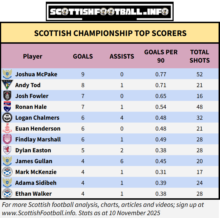 81 different players have now scored in the Scottish Championship this season, and the following table contains all players to score four or more, while also showing their number of assists.