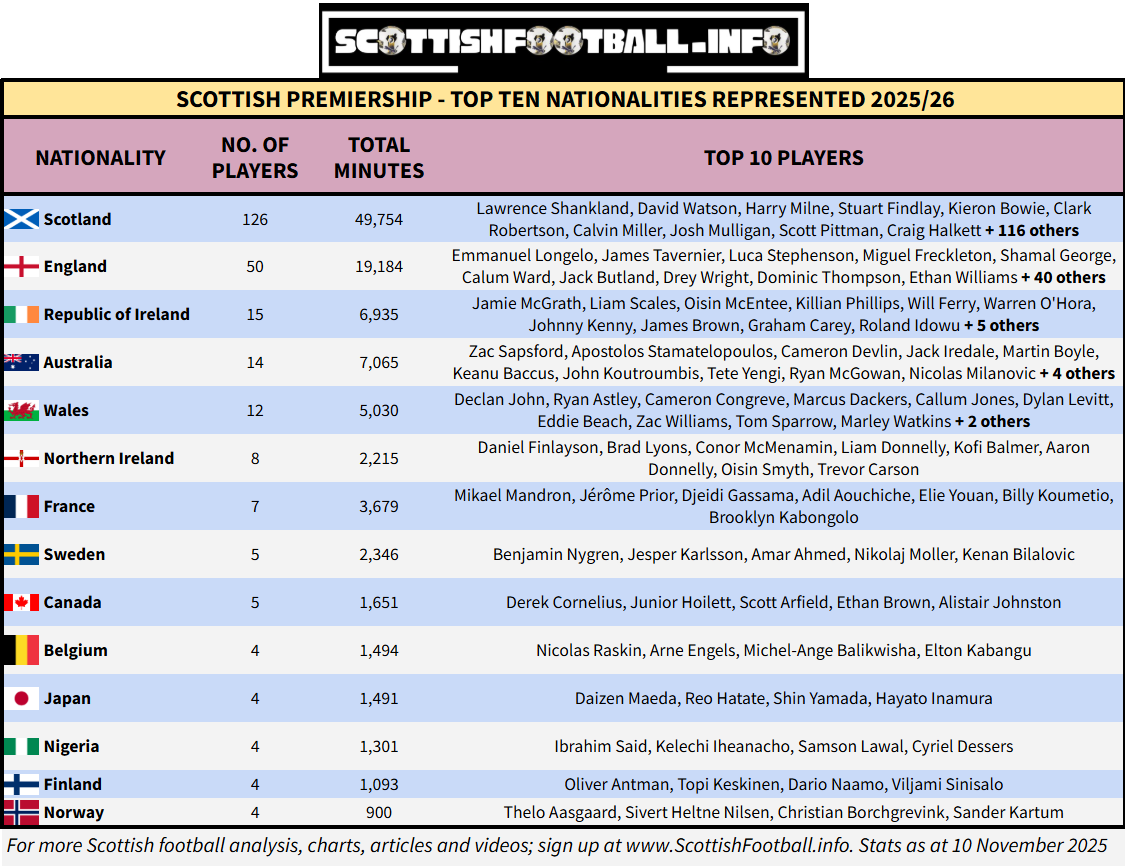 There have been 61 nationalities represented in the Premiership so far this season, all nations with 4+ players are shown below - with the total minutes played and by how many players.