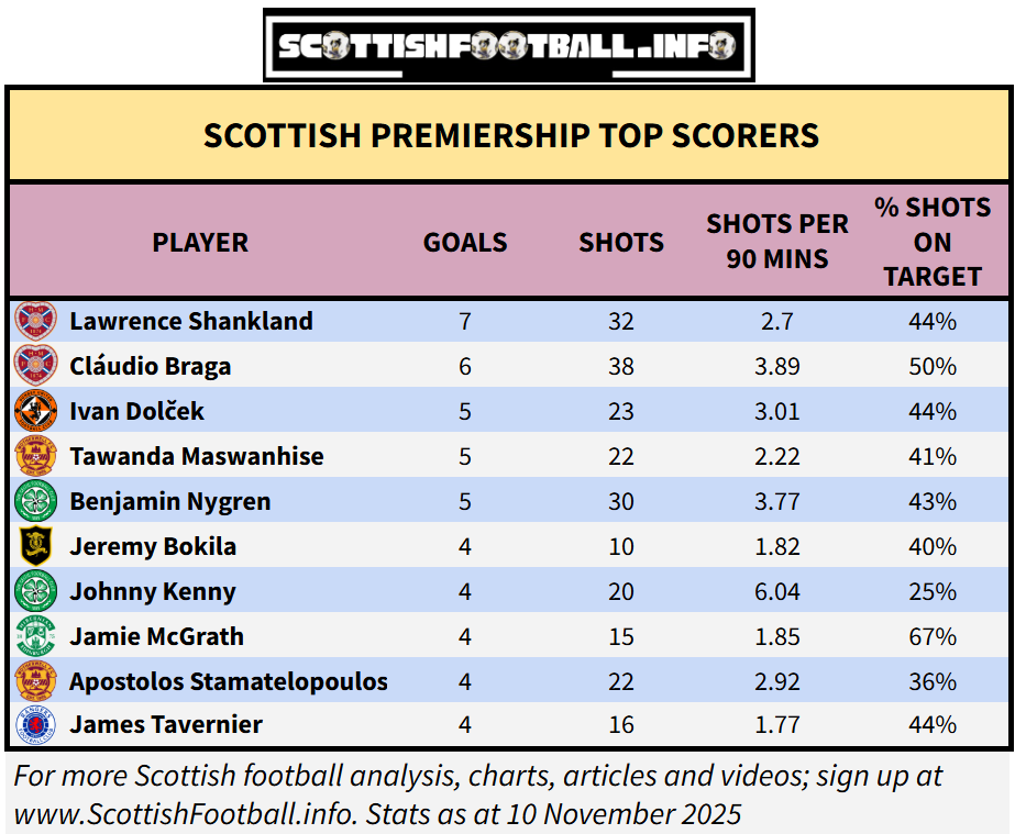 Exactly 100 different players have now scored in the Scottish Premiership this season, and the following table contains the top 10 scorers in the league, showing the number of shots taken, shots per 90 minutes and % of shots on target. Claudio Braga has taken the most shots in the league (38), and 50% of those shots were on target, a percentage only bettered by Jamie McGrath (67%).