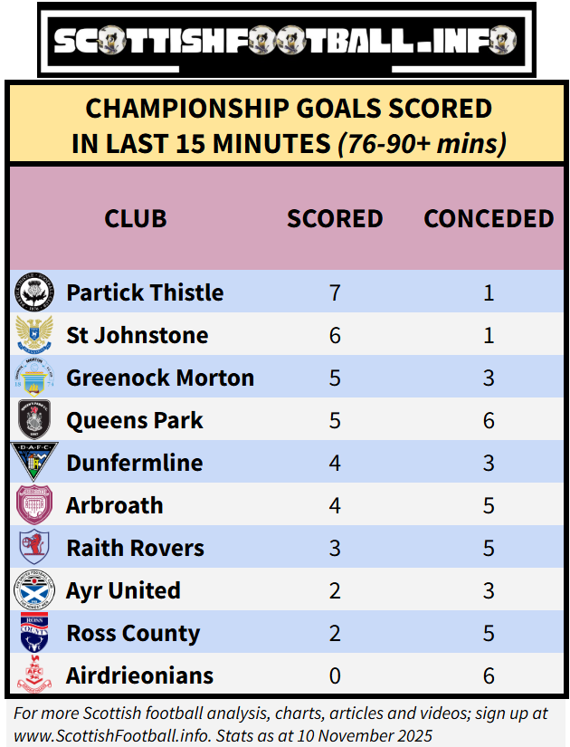 Partick Thistle not only start matches well, but are also the best in the division in terms of late goals, scoring 7 and conceding 1; the exact same ratio as they have in the opening 15 minutes. Airdrieonians are yet to score a late goal while have conceded late on six times.