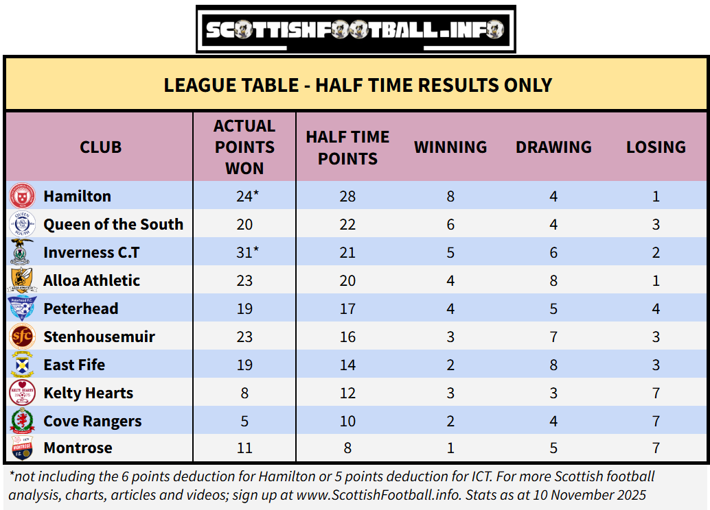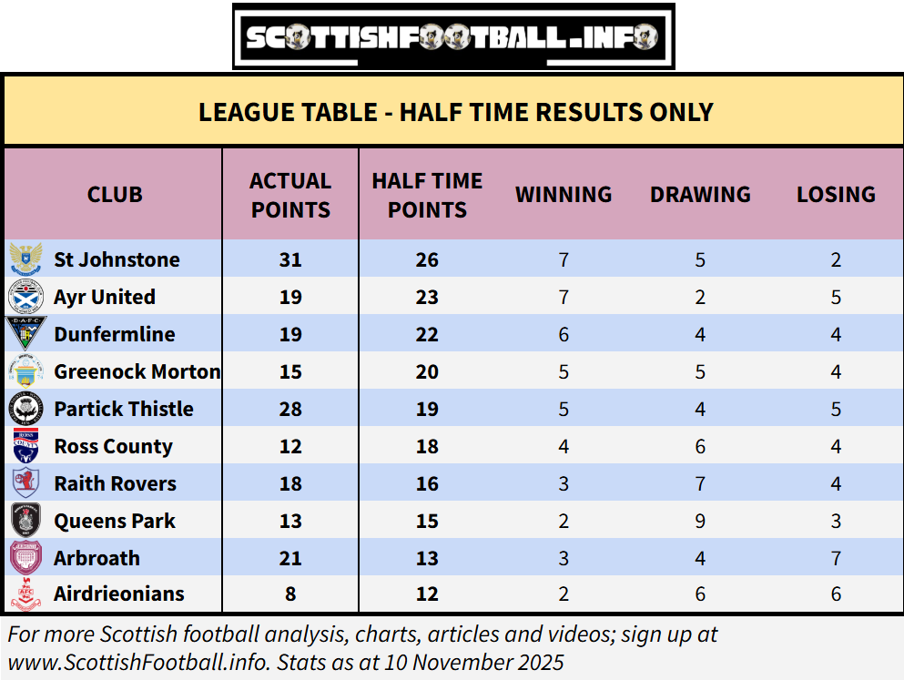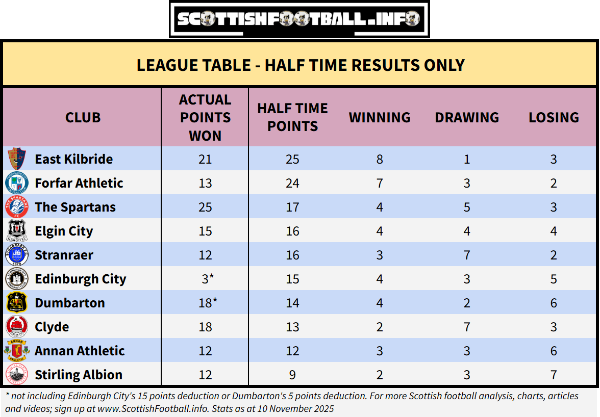 This table looks at how each team has performed based solely on their half-time scores, rather than the actual full time results. It shows how many points each club would have if matches ended after 45 mins, along with their number of wins, draws and losses at that stage. It’s a useful indicator of how well teams start games, their control in first halves, and which sides tend to fade or improve after the break. Forfar
