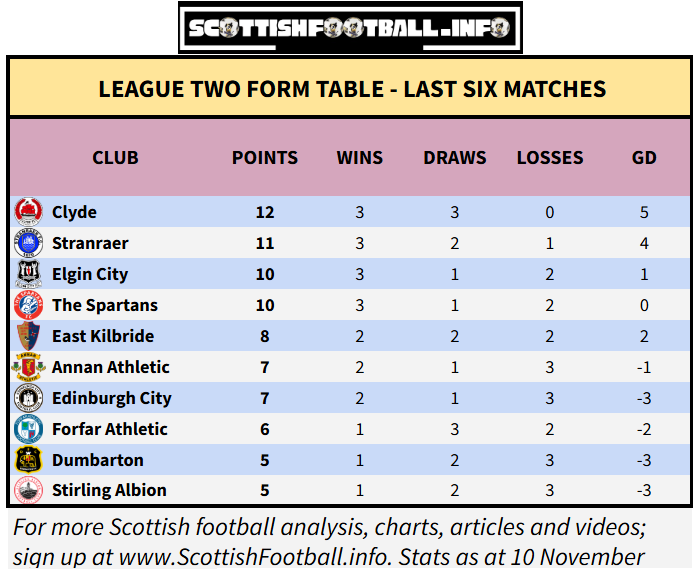 Clyde are now up to third place in the division, and are the only undefeated team in League Two over the past six matches. Stirling Albion have dropped to 8th, as they have collected just five points from the last 18 available. That’s the same as Dumbarton, who still sit 5th - but are now 12 points behind league leaders Spartans.
