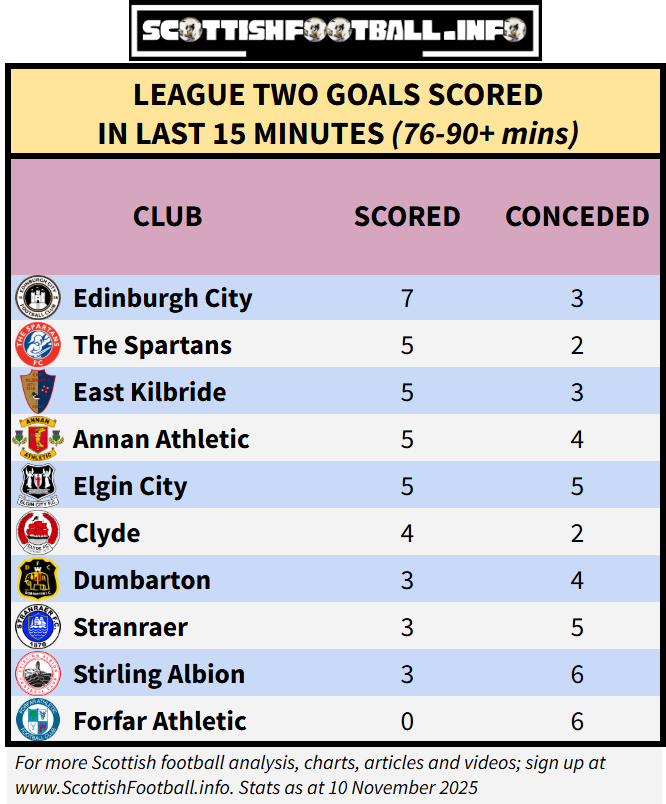 It’s worth staying to the end at League Two matches - a massive 40 goals have been scored in the final 15 minutes. Edinburgh City have scored the most late goals (7), while Forfar fans may want to leave at 75 minutes to improve their moods - they are yet to see their side score a late goal but have witness them conceding late goals on 6 occasions.