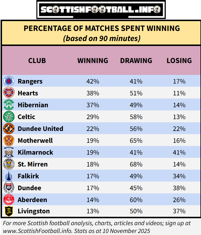 This table shows the proportion of total match time each team has spent in a winning position this season. The league’s actual top four are also the top four here, albeit in a different order. Hearts have only been losing for 11% of the minutes played, while Livingston have been leading for only 13% of the time.