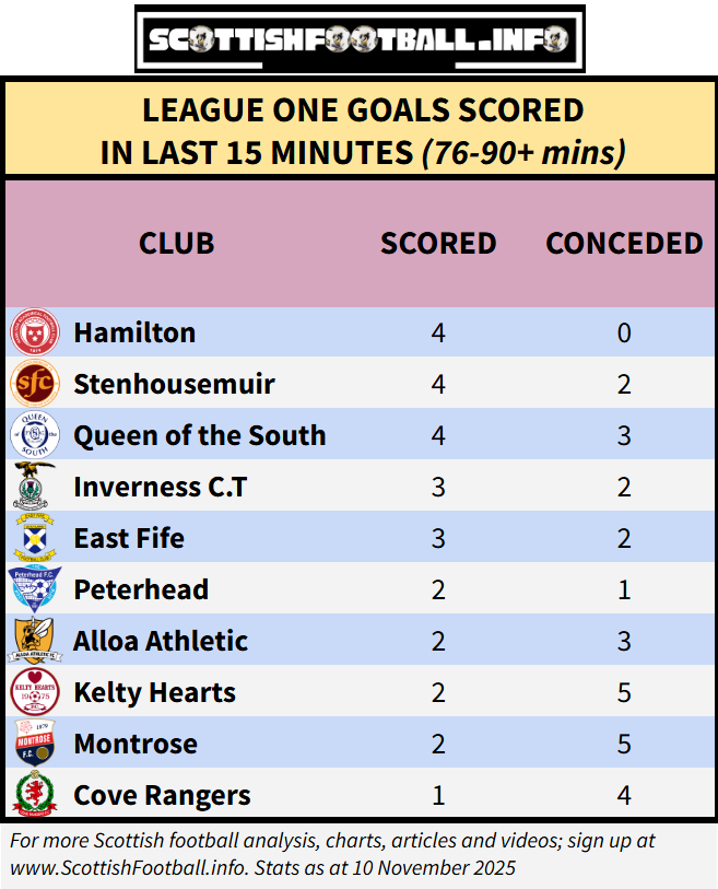 Due to a points deduction, Hamilton sit 7th rather than 2nd, and the Accies are the best team in the league in the opening 15 minutes - yet to concede in this period, while scoring four times themselves. Cove Rangers - with 1 win from 13 matches - unsurprisingly end games nearly as poorly as they start, conceding 4 times while scoring just once.