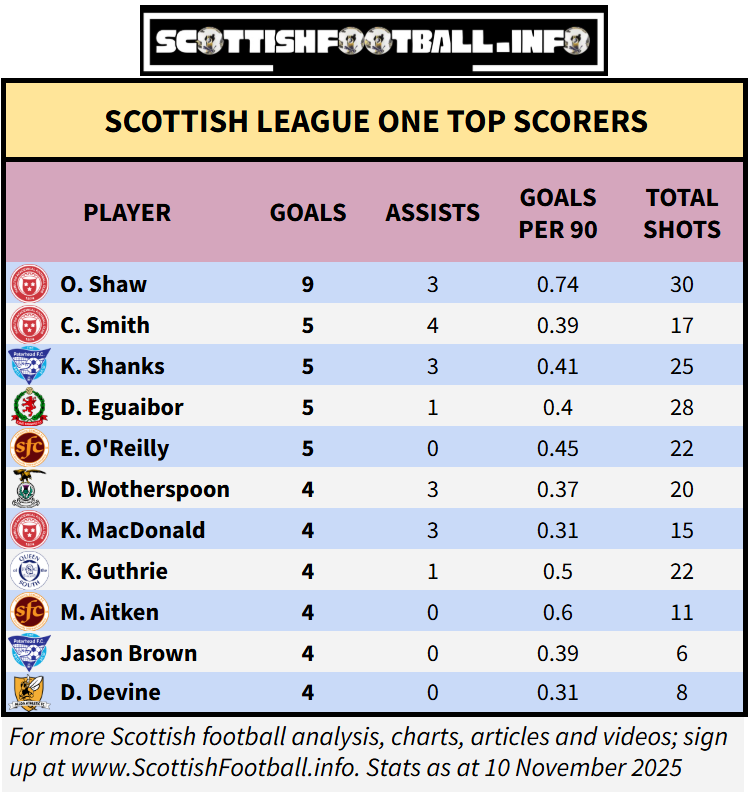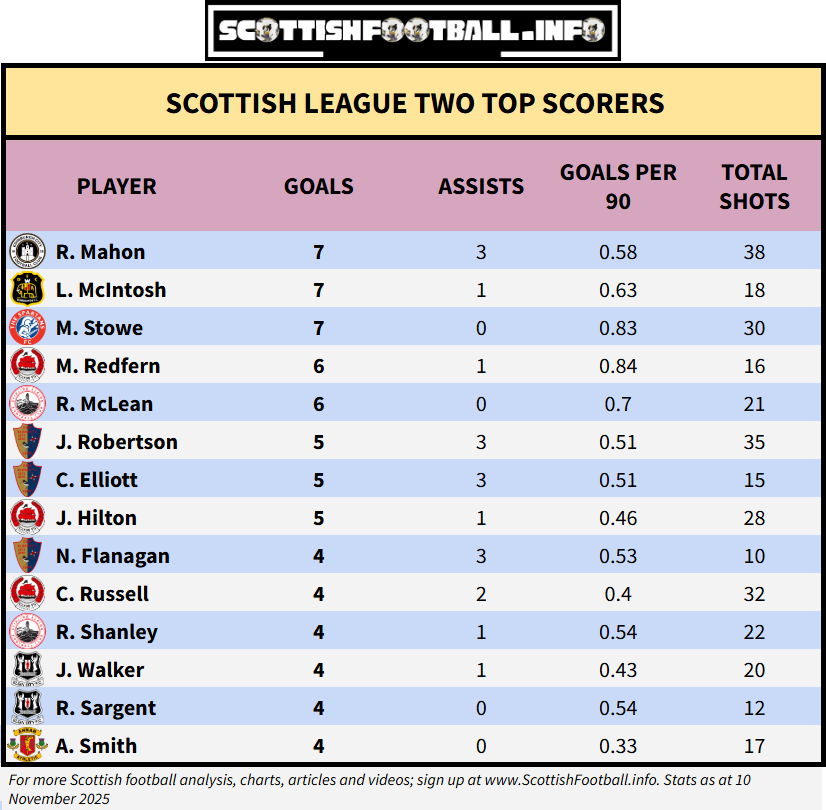 Young Edinburgh City striker Robbie Mahon remains the league’s top scorer with seven goals, and has also taken the highest number of shots (38).