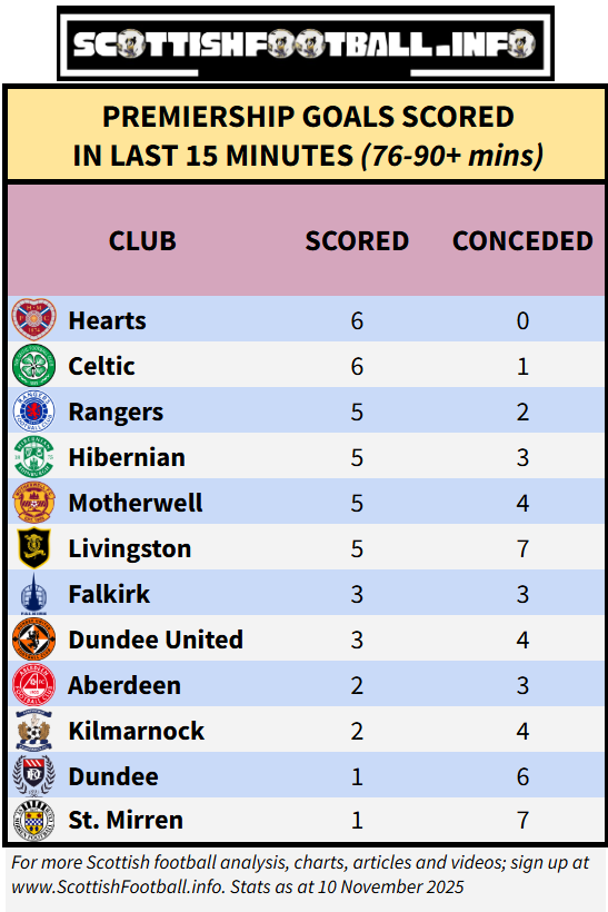 Hearts are the only team yet to concede a late goal, while also scoring the most (joint with Celtic). St. Mirren have only scored once in the last 15 minutes but have conceded 7 times.
