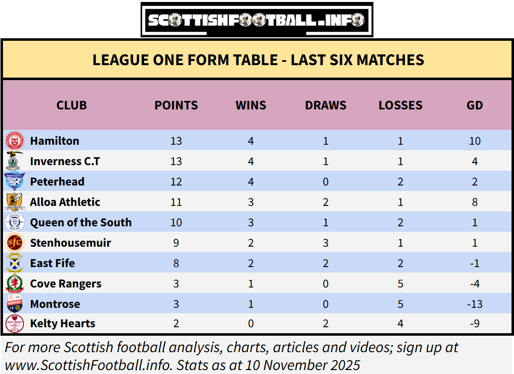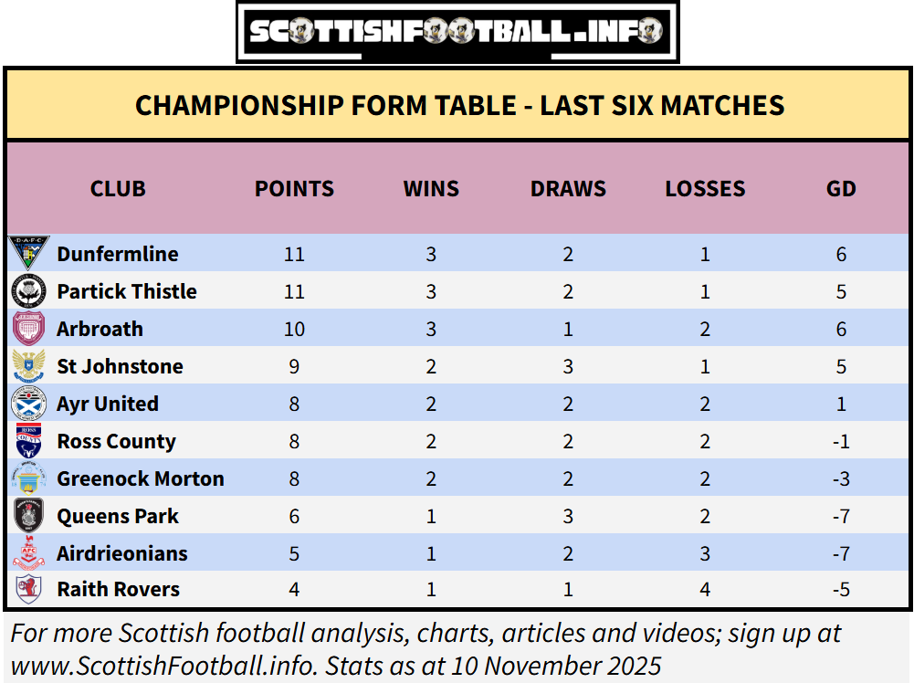 Dunfermline are in the joint best form in the league, which has them up to fourth in the table - but still 9 points behind second place Partick Thistle who have also lost only one of their past six matches.