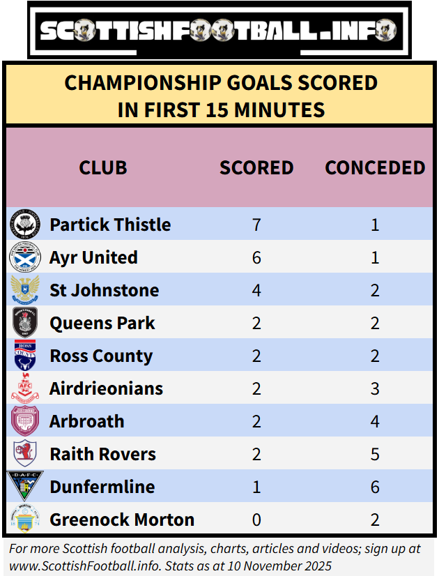 Partick Thistle (7 goals) and Ayr United (6 goals) both have extremely fast starts in the Championship, while each conceding just one early goal. Dunfermline have only scored once in the opening 15 minutes but have conceded 6 times, a league high.