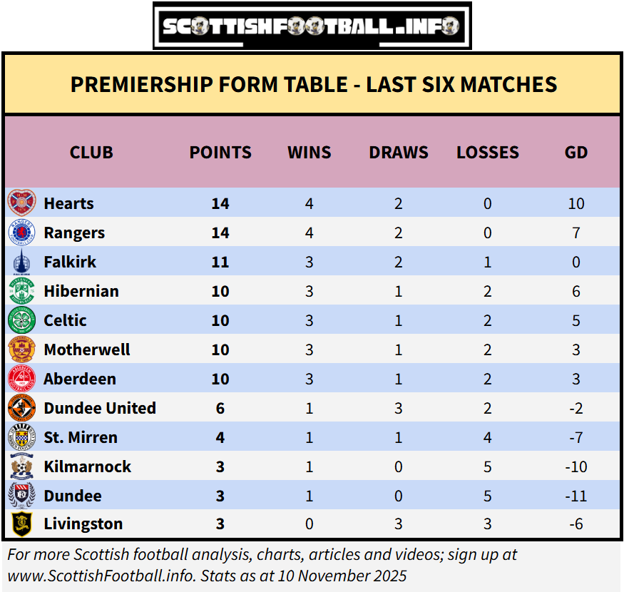 Despite two draws in the last six matches, Hearts are still in the best form in the league (joint with Rangers), while Falkirk are in slightly better form than both Hibs and Celtic. At the other end; Livingston, Dundee and Kilmarnock have all taken only 3 out of the last 18 points available.