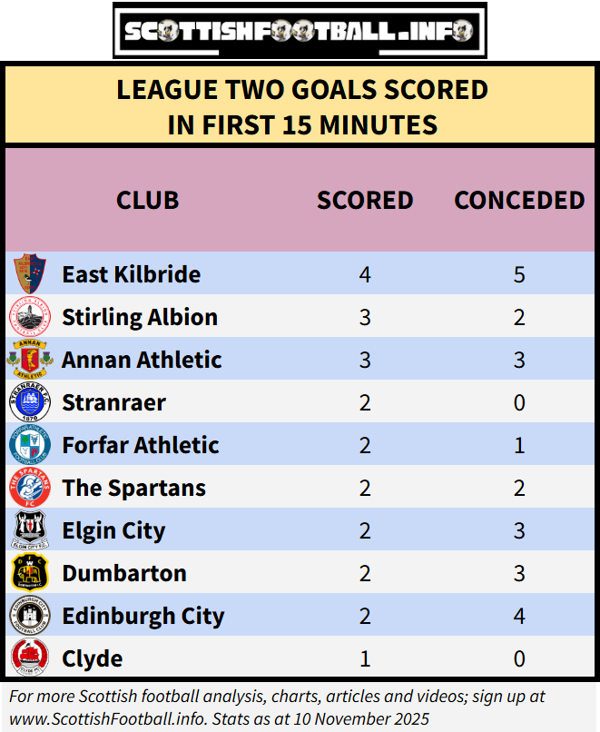 There have been 23 goals scored in the opening 15 minutes of League Two matches, with 9 of these in matches involving East Kilbride (scoring 4 and conceding 5). Matches involving Clyde are the slowest to start, they’ve scored one early goal and are yet to concede one.
