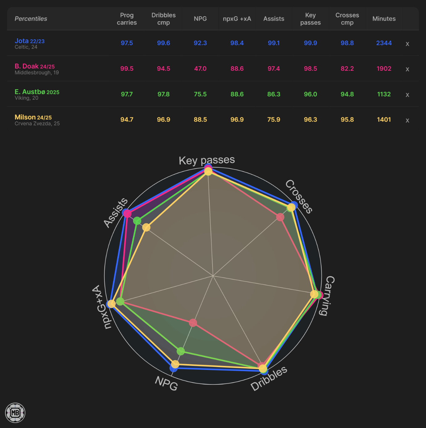 The logic holds: keep Maeda as the starter, cover Jota with a loan and option if possible, and only buy if the profile genuinely moves the needle in breaking down low blocks (progressive carries, successful dribbles, key passes, xG+xA). In that frame, Doak is the swing-for-upside loan, Austbø the young permanent who mirrors the Jota-ish actions, and Milson the experienced floor-raiser who helps immediately without blocking future choices.
