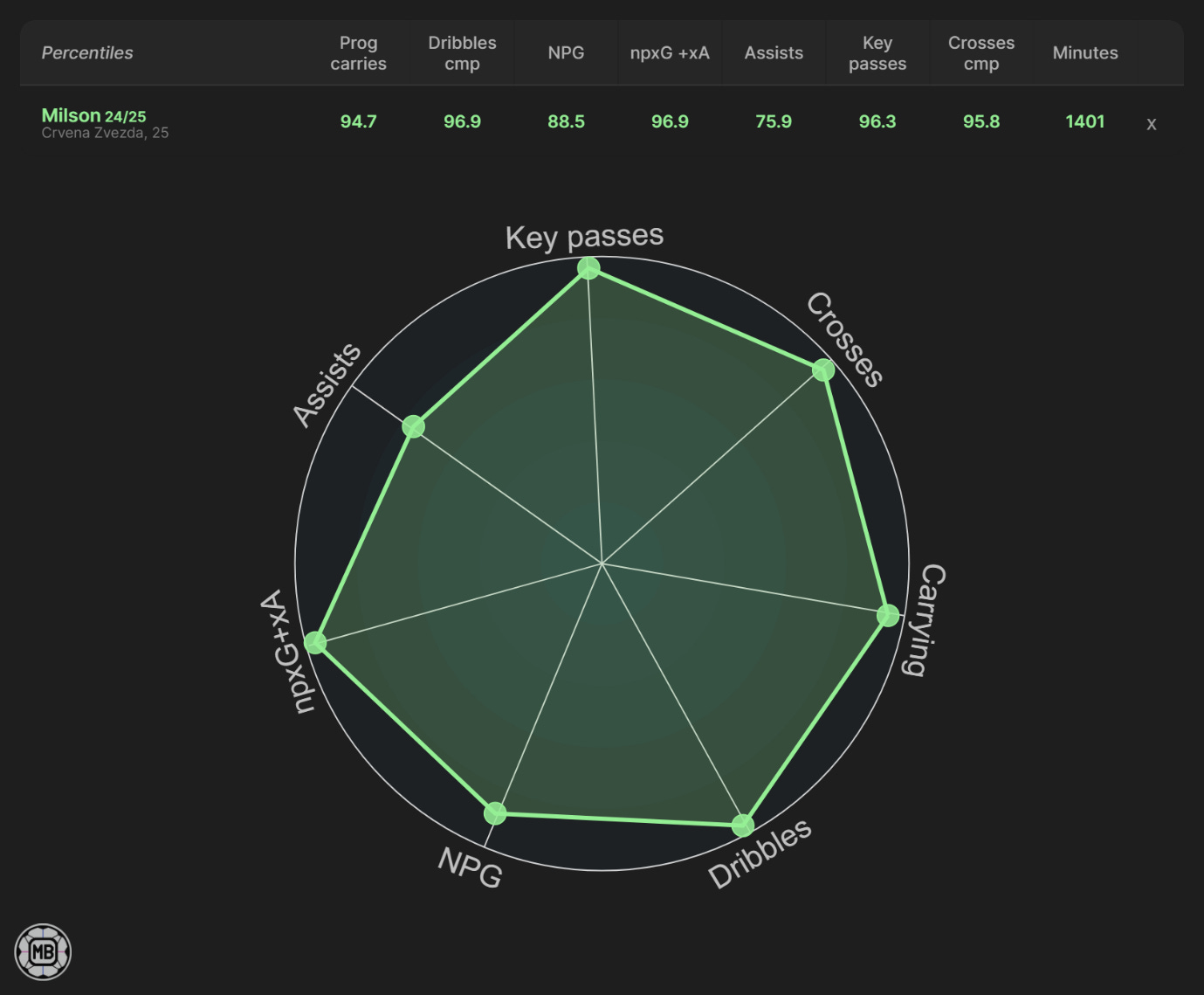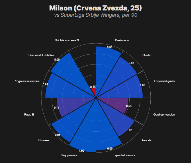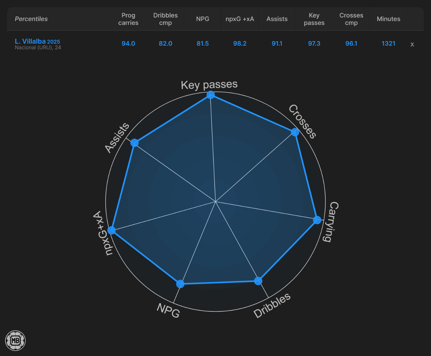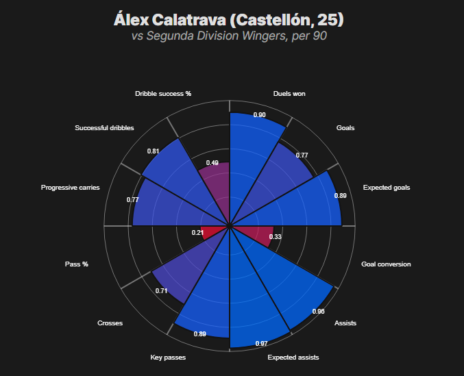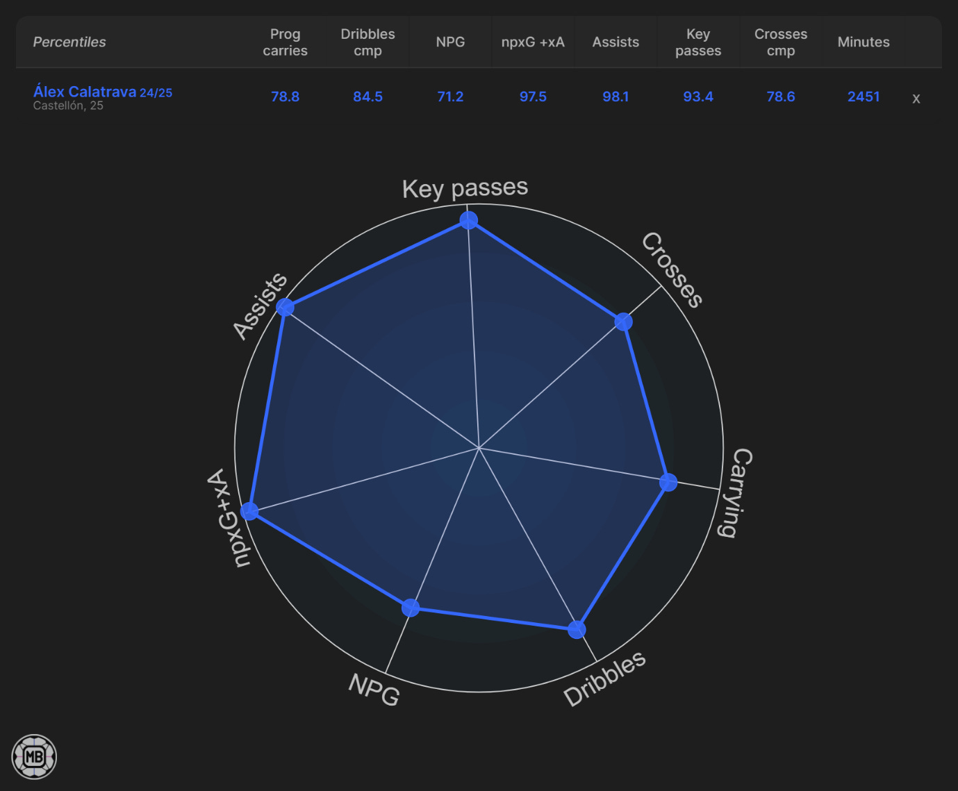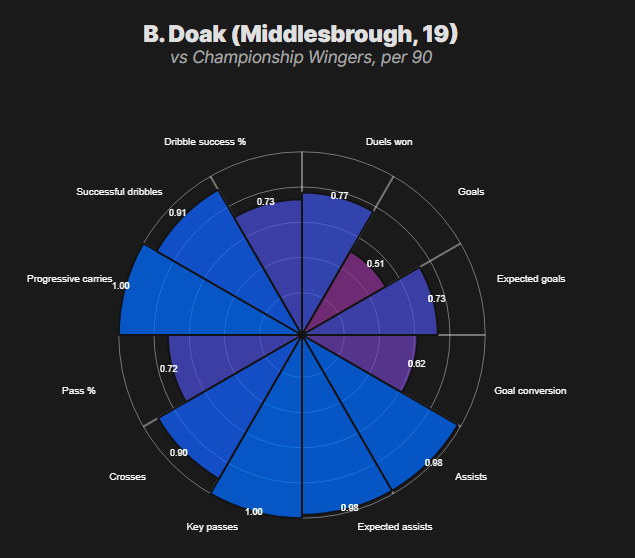 Numbers snapshot: Strong league-relative ranks across key chance-creation and scoring metrics; dribble completions way short of "elite" tier.