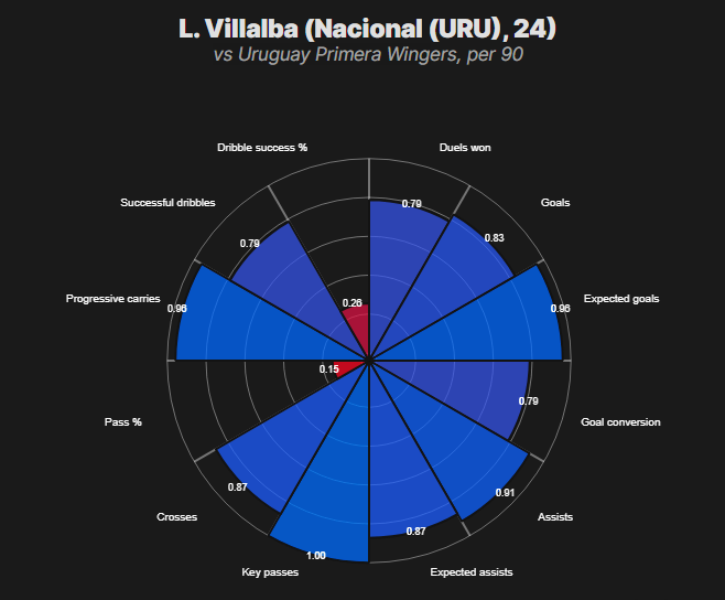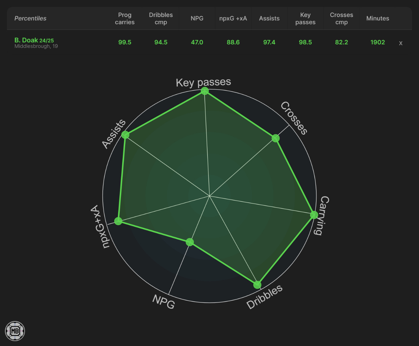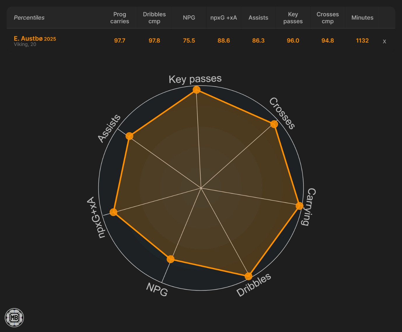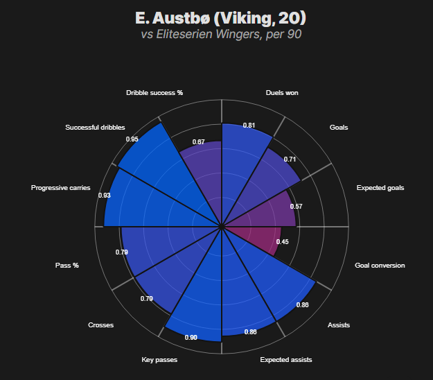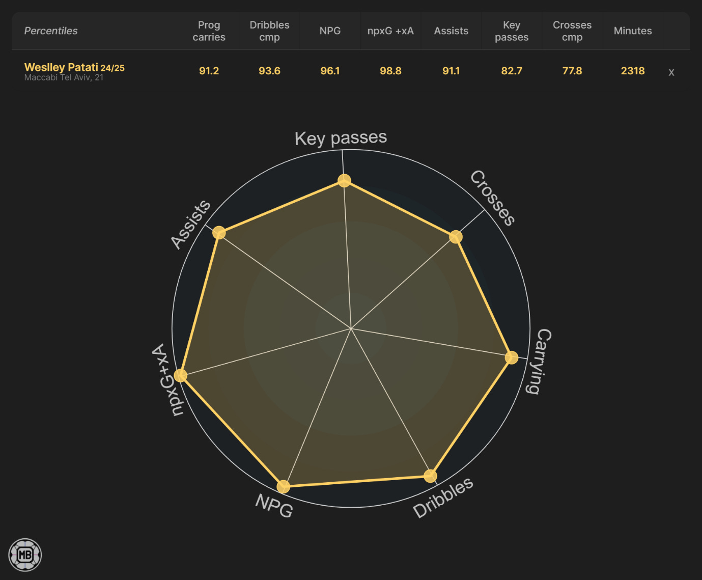 Numbers snapshot: Strong league-relative ranks across key chance-creation and scoring metrics; dribble completions way short of "elite" tier.