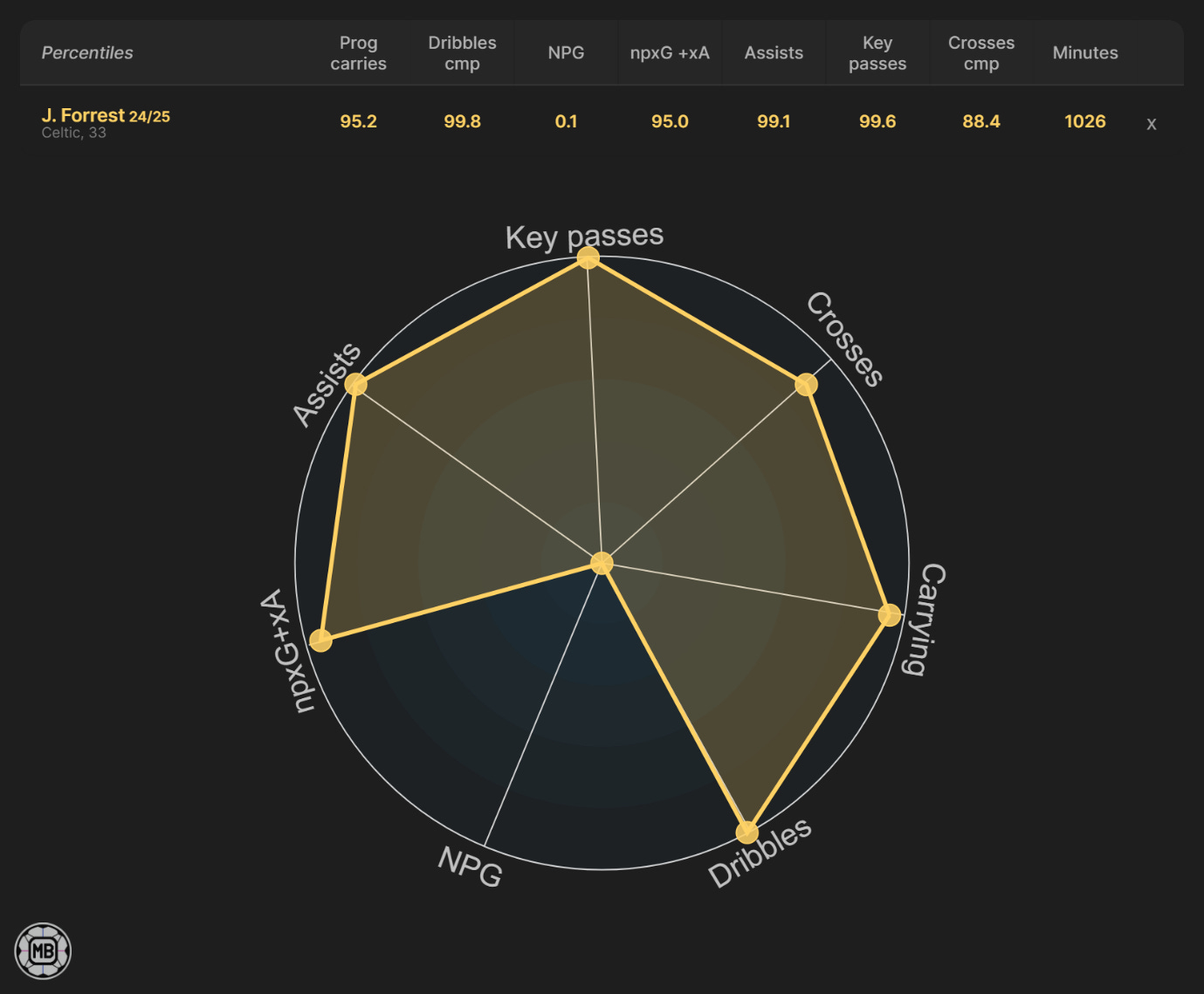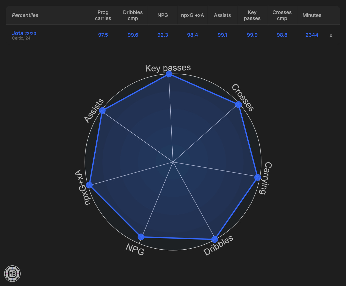 It's a straightforward summary: Jota was in elite categories in all key metrics for a winger in Scotland, which is unsurprising, considering it was partly this form that led to him leaving Celtic for around £25 million to Al Ittihad.