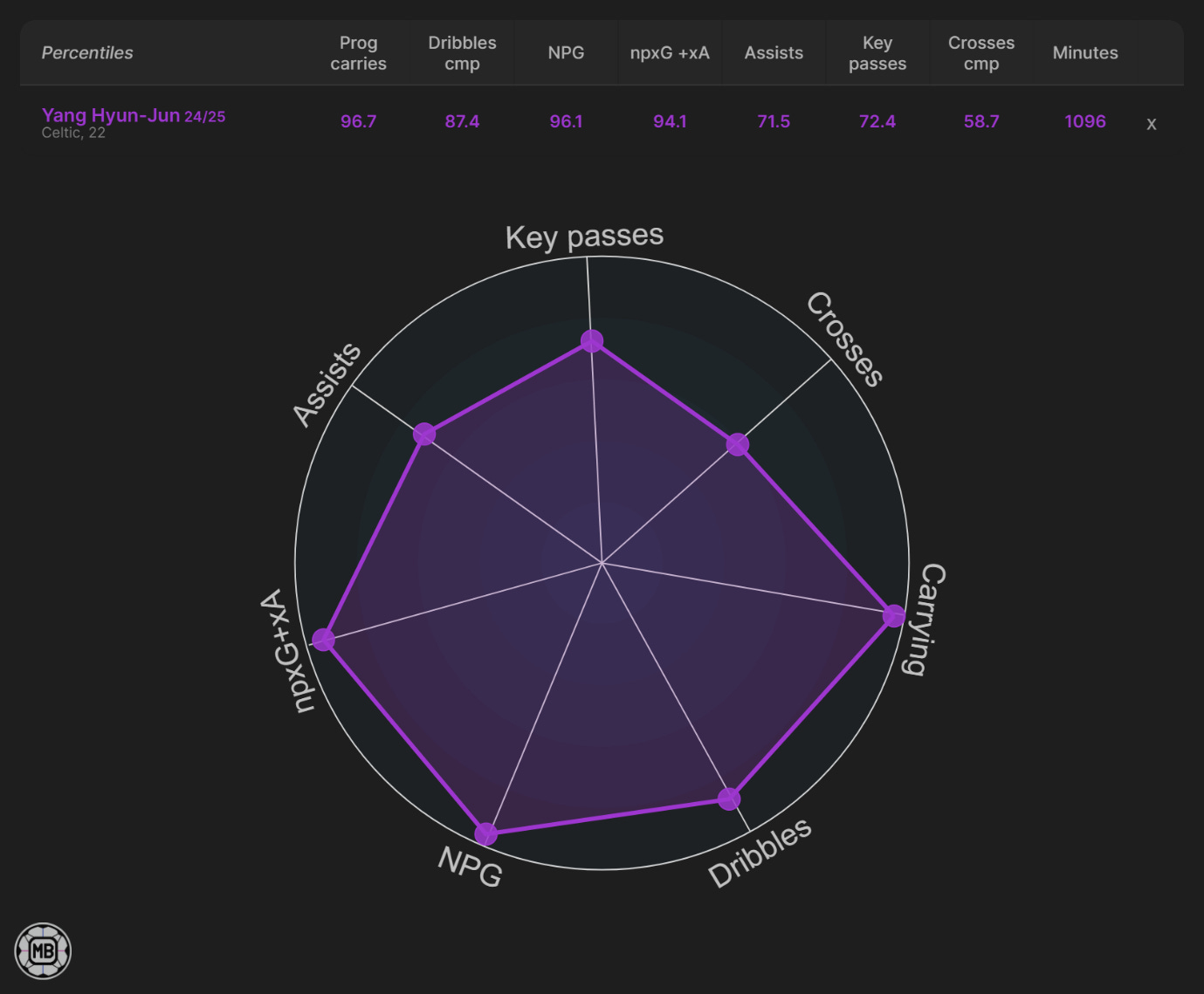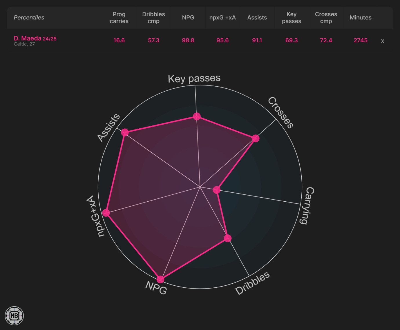 Maeda is not without flaws. His data profile shows an excellent end product, solid key passes and cross completion numbers, but weaker dribbling and ball progression. Attempting 3.33 dribbles per 90, he completes 59.6% of them, yet his progressive carries and passes remain well below top-tier levels. He is the player you want to suffocate teams in the left channel, get on the end of chances, and lead counters, not the one to break down low blocks through dribbling and passing. Still, he remains Celtic's most crucial winger, and that is unlikely to change regardless of new arrivals.