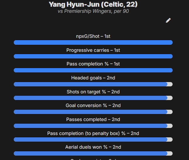 He ranks first in the league for progressive carries per 90, has the Premiership's highest npxG/shot (0.22), and is second only to Maeda in goal conversion (31.25%) as well as a slew of other categories. However, his creative output is lacking, and consistency remains the most significant issue. Without repeated strong performances, he is hard to rely on. A loan spell offering regular minutes could be the key to unlocking his potential.