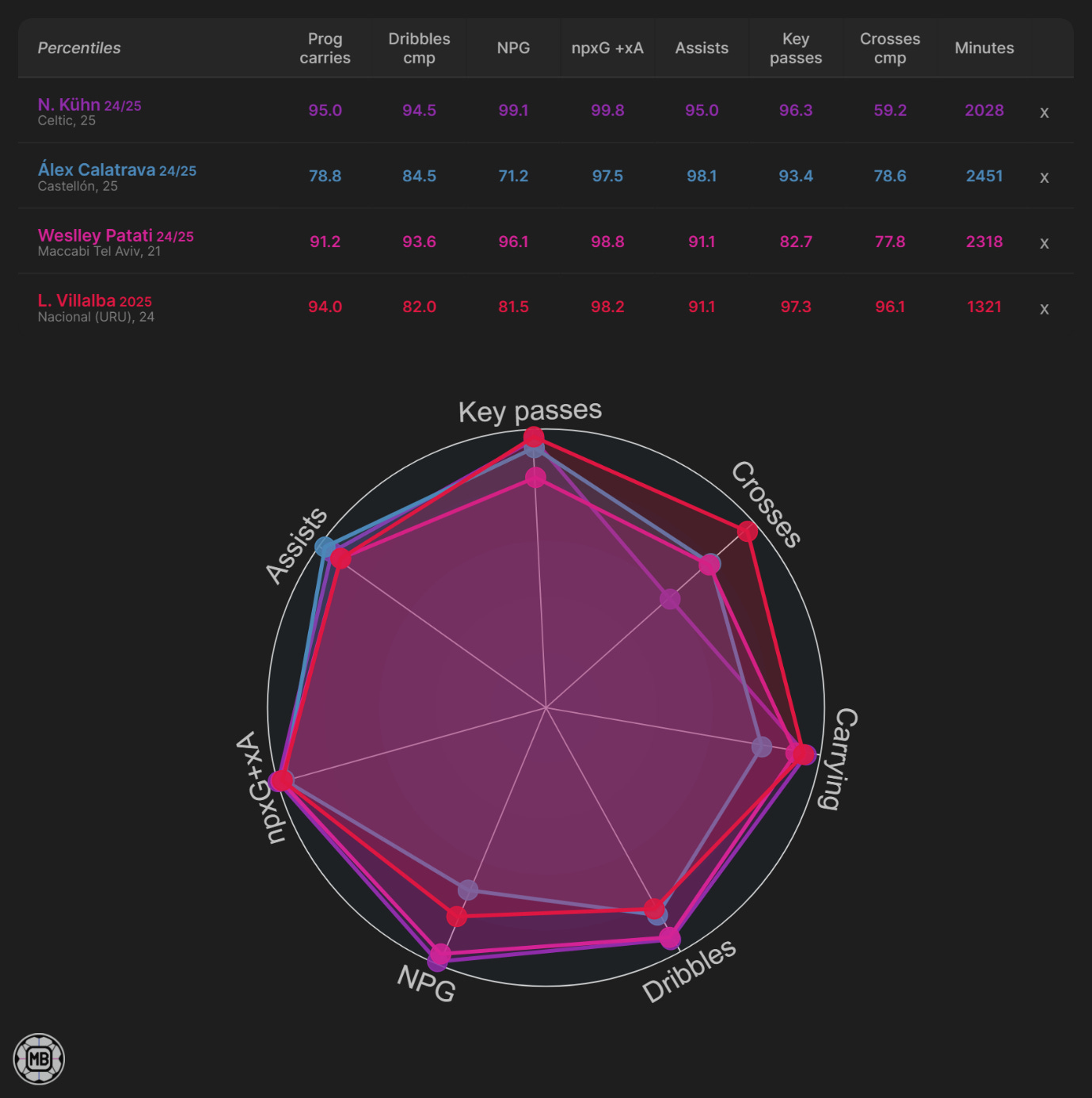 To find a realistic Nicolas Kuhn replacement, the search focuses on the metrics that defined his value while staying within Celtic's budget and tactical brief. We're targeting a left-footed RW (18–26), ≤ €5m on Transfermarkt, with ≥900 competitive minutes to avoid small-sample noise. Use percentiles over raw counts: ≥75th for progressive carries and key passes; ≥80th for successful dribbles—mirroring Kuhn's 1v1 and ball-advancing edge. End product matters too: ≥65th for non-penalty goals, assists, and accurate crosses, plus ≥75th for npxG+xA to guarantee consistent threat. That mix of progression, creativity, and output—at an affordable price and with a European-ready profile—maximises the chance of landing someone who can replicate Kuhn and even improve the crossing/variety piece he sometimes lacked.