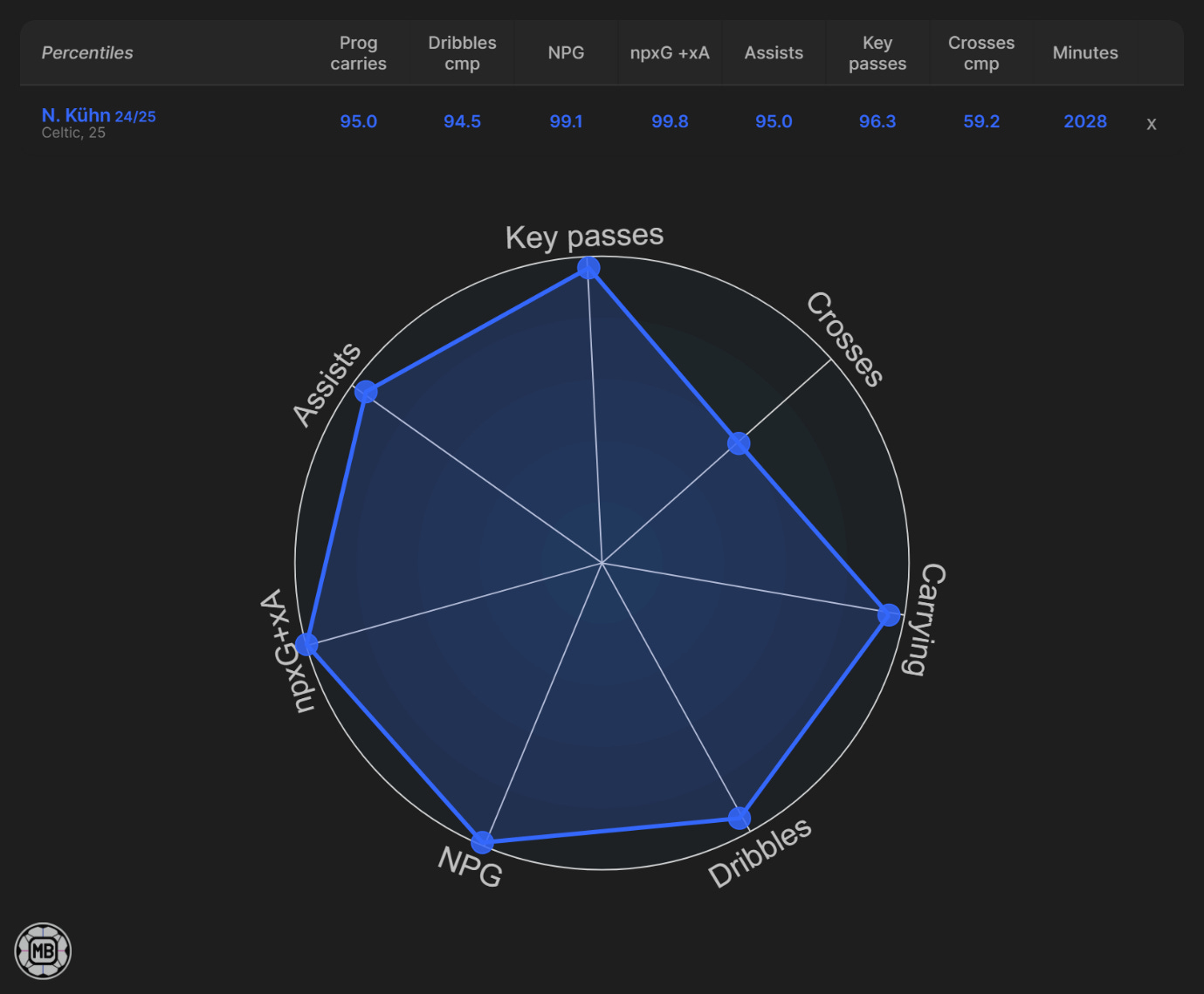 And speaking of Kuhn, his departure from Celtic was confirmed on July 11th as he signed for Cesc Fàbregas' Como for a fee of over £16.5 million. He had a very similar season in terms of absolutely exploding for Celtic, much like Jota did in 22/23, ranking in elite categories across the board (except for cross completion). Similarly, his domestic excellence was bolstered by strong performances in the Champions League, where he scored and created crucial goals. He does differ tactically; Kuhn is a traditional winger who likes to stay as wide as possible, hug the touchline, or cut inside to shoot, as a result of being left-footed. This would offer a nice balance to his opposite winger.