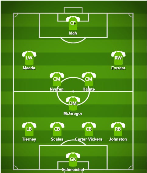 The main points of contention will be RW, as Yang started on Flag Day, and Forrest started against Aberdeen, so there is no clear favourite yet. However, I do believe Forrest will start. The other position potentially up for grabs is ST, as since rejoining Celtic permanently Adam Idah has underwhelmed massively in the pre-season and the first two league games. Yamada would have been hoping for the chance to impress Rodgers in the League Cup against Falkirk, however it was Johnny Kenny who was surprisingly given the nod to start.