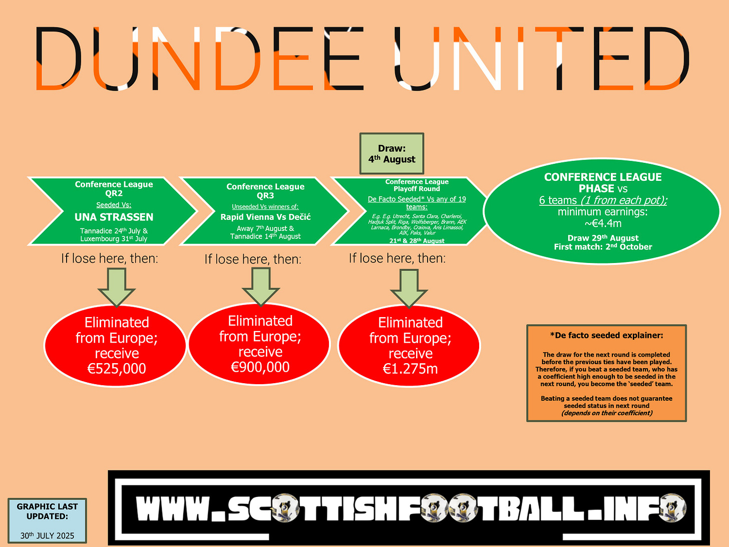Rapid would probably be the hardest team United would face in qualifying, as if they defeat the Austrians, Dundee United take their coefficient for the Playoff round and so would be on the seeded side of the draw, and could only face one of the 19 unseeded teams. The draw for this takes place on Monday, and so we’ll know in advance who awaits, should they make it that far. Utrecht, Charleroi, Hadjuk Split and Brondby would likely be some of the teams they’d want to avoid - but there would be several unseeded teams that Dundee United would rightly fancy their chances again, and these teams will be narrowed down further on Monday morning.