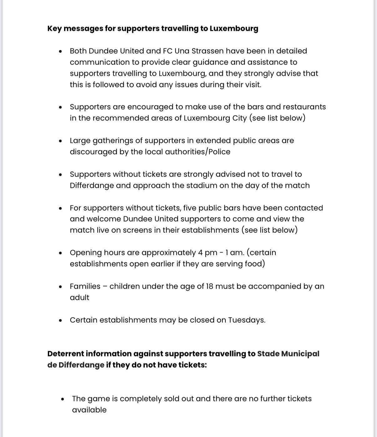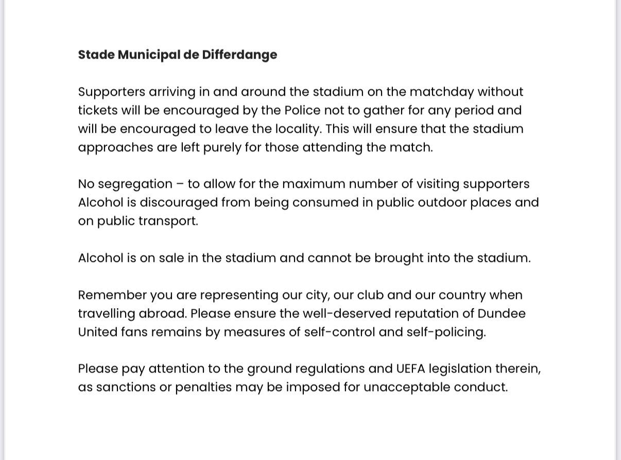 Lastly are attached excerpts of the key messages issued to Dundee United fans ahead of the trip. Most pertinently, alcohol is on sale in the stadium!