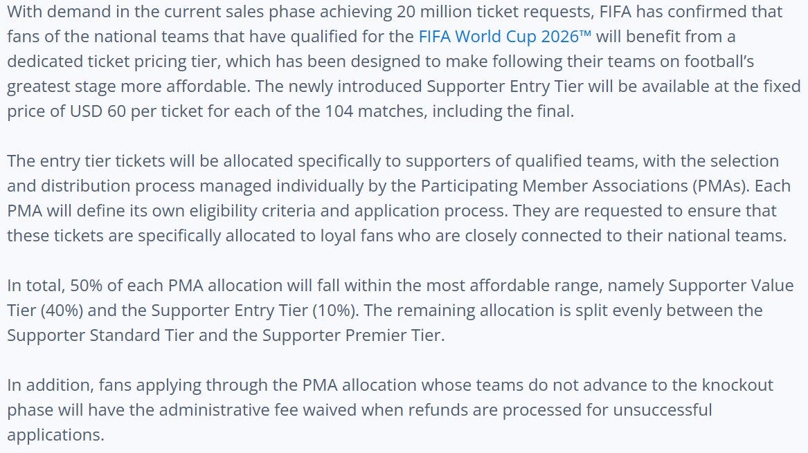 If FIFA were serious about responding to supporter concerns, there were several obvious alternatives. They could have reclassified tickets from the $700 “premium” tier, increased the overall national association allocation, or extended the $60 tickets beyond more than just 10% of the PMA allocation. None of that has happened.