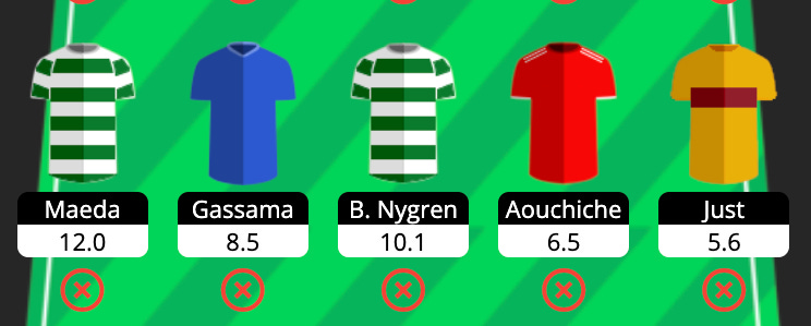 GW12 → Maeda + Nygren, Gassama, plus one of the emerging Hibs/Hearts mids.