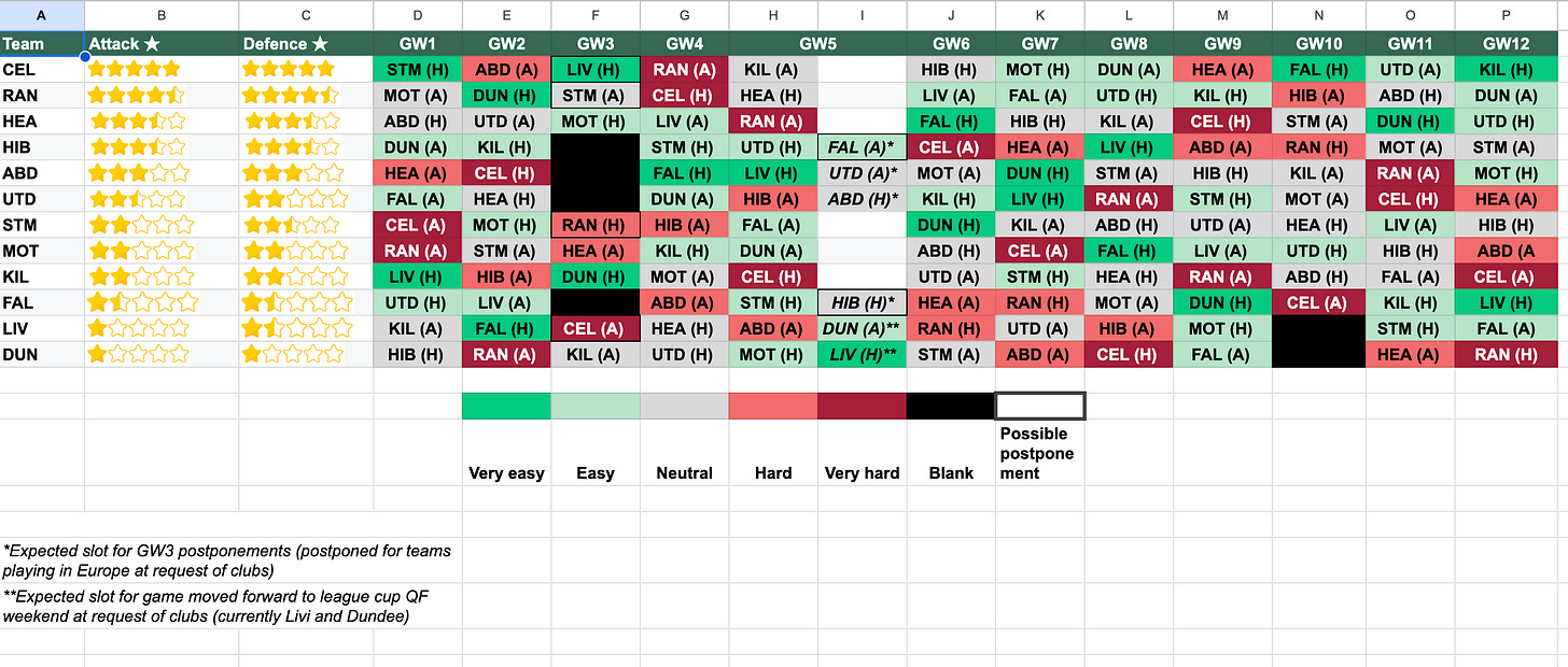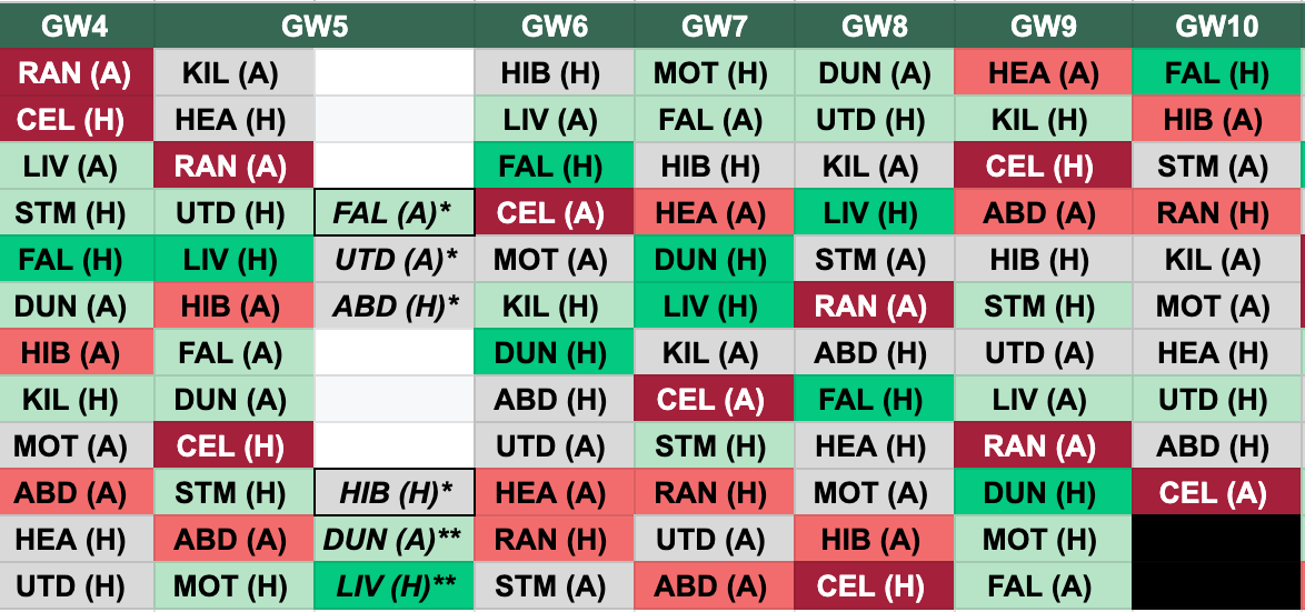 Hibs → fantastic for DGW5, but tough after (Celtic/Hearts/Aberdeen away + Rangers H). Plan your exits.