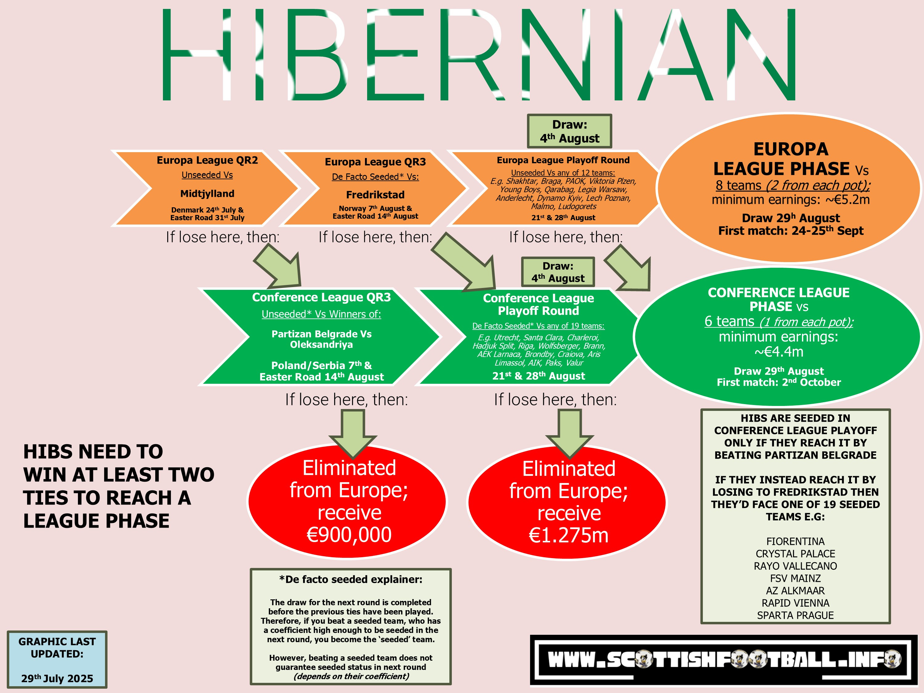Win or lose, Hibs know that they will not only play in a third qualifying round tie next week, but ALSO will be in the playoff round draw on Monday lunchtime. This of course means at least one more Hibs away tie (uh huh uh huh) - but there could be as many as six more by January. This article will cover their routes from Thursday night to a league phase spot come the end of August.