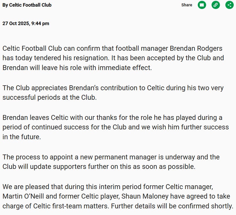As for Rodgers’ departure, Dermot Desmond - Celtic’s largest shareholder (though he does not hold a majority) - issued one of the most extraordinary and personal statements ever seen following the exit of a successful manager.