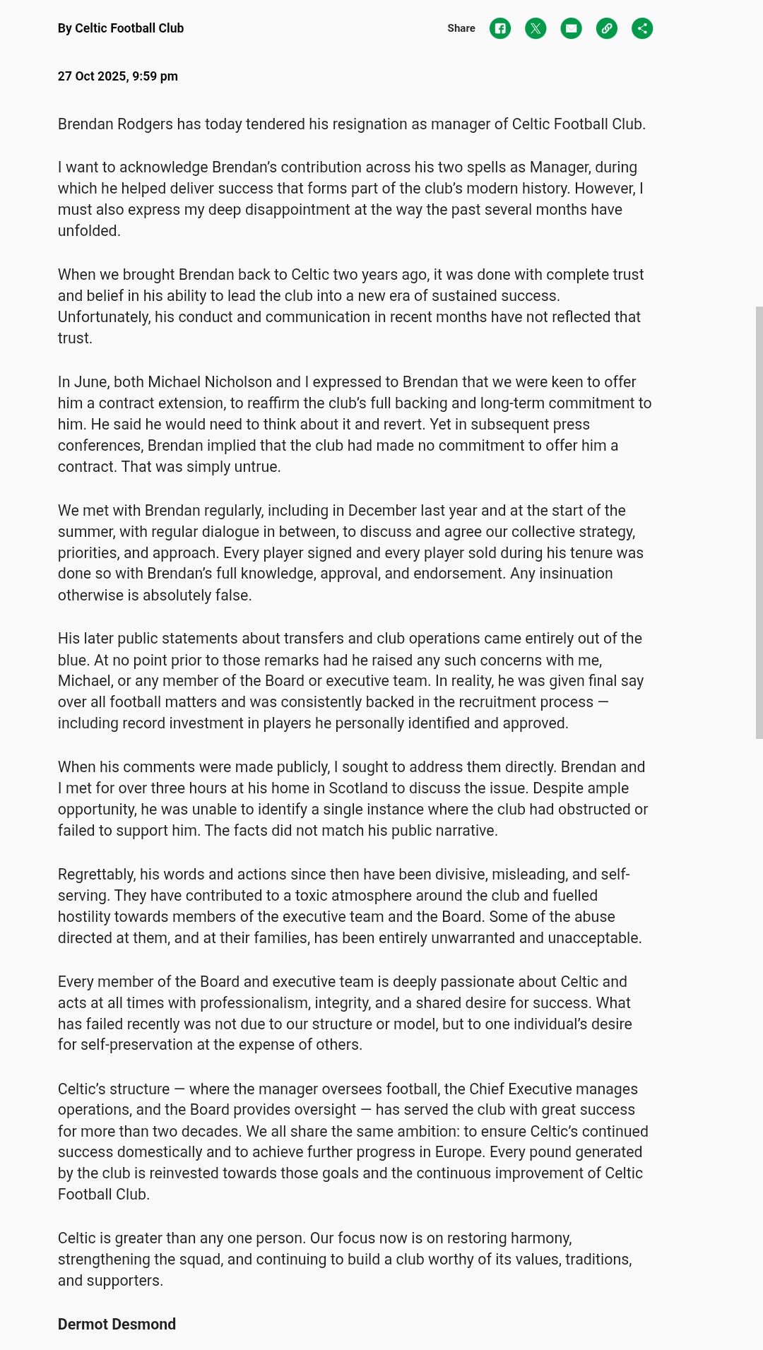 The statement was a complete character assassination of Rodgers and it underlines that Dermot Desmond retains ultimate control at Celtic. There was no statement from either the Celtic CEO Michael Nicholson or the chairman Peter Lawwell.