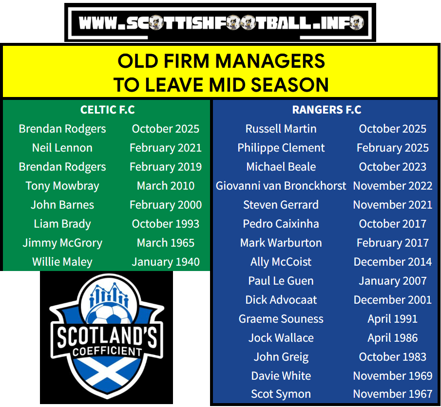 The previous closest instances of both losing managers mid season came in 2021, when Neil Lennon resigned as Celtic manager in the February and Steven Gerrard left Rangers for Aston Villa in the November. Same calendar year, but different seasons. Wim Jansen and Walter Smith both left their respective clubs in May 1998, however they were both end of season departures rather than leaving mid season.