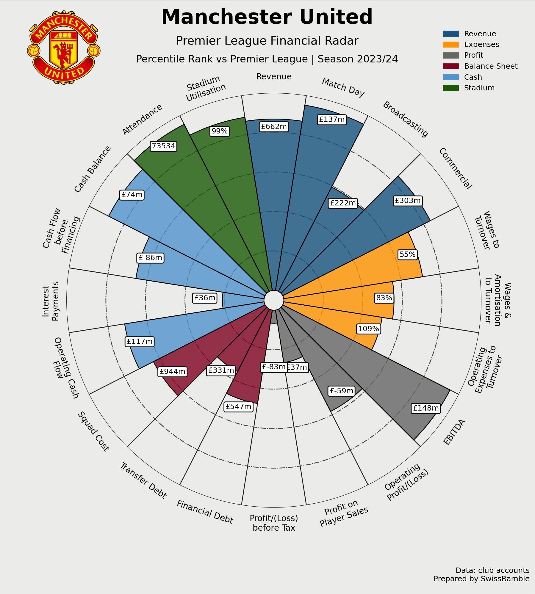 . He has over 30,000 subscribers on his website and nearly 250,000 followers on twitter, and for good reason. He produces a fantastic breakdown of finance in football, especially for the mind-blowing sums involved in the English Premier League.Last week, he released his own financial football radars - based on existing football stats radars which are used to illustrate a player’s quality compared to their peer group. It was a truly brilliant idea, and he has sought out some expert guidance to help him perfect the computer code to allow him to create very detailed financial radars, such as this for Manchester United: