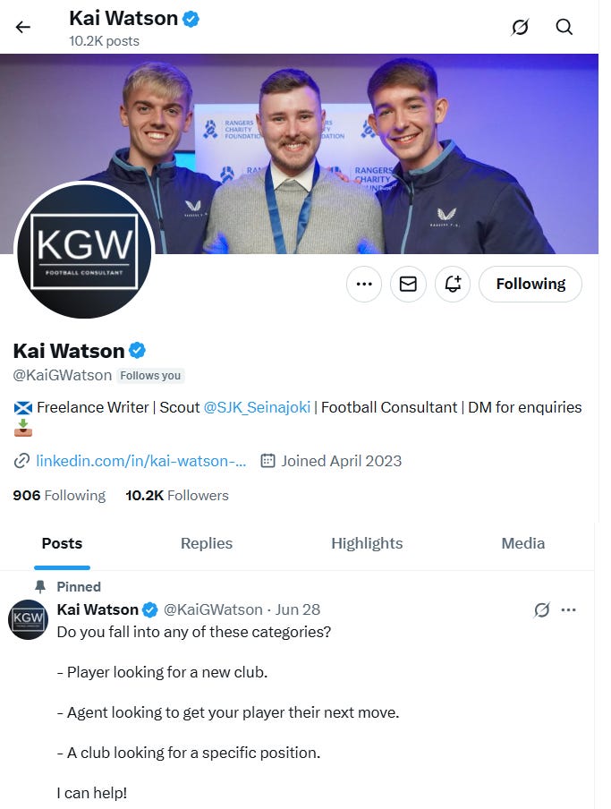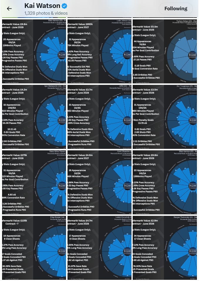 Like myself, Kai is a freelance writer who has built up a five figure following on social media. He has a BsC in sports coaching and performs consultancy work for many clubs, and is a scout for the professional Finnish team, SJK Seinäjoki. However, you most likely know him from his viral threads on twitter, where he evaluates and recommends players based on data and video analysis. His output is now instantly recognisable as a blue radar illustrating the percentile stats for the player, with the detail laid out on on the left hand side.