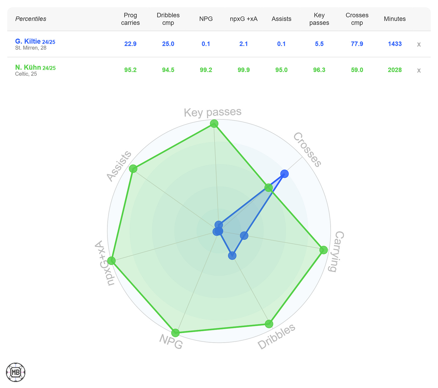 Radars of course don’t tell the whole story, and in player recruitment they may be one of many tools used to narrow down a large field of targets, to then be supplemented by actual video analysis and scouting of a player. A ‘poor’ looking radar doesn’t necessary mean the player is a poor performer. For example, while Kiltie’s radar from last season might not be as impressive as Kühn’s, Kiltie wasn’t playing for the best team in the country! He still played 30 matches for St. Mirren, and Saints manager Stephen Robinson said he has been an “integral part” of what the team has achieved in recent years. Last month Kiltie, rejoined Kilmarnock with new manager Kettlewell stating “Greg is a player I've admired for a number of years and he's one I'm confident will fit in well with our squad.”
