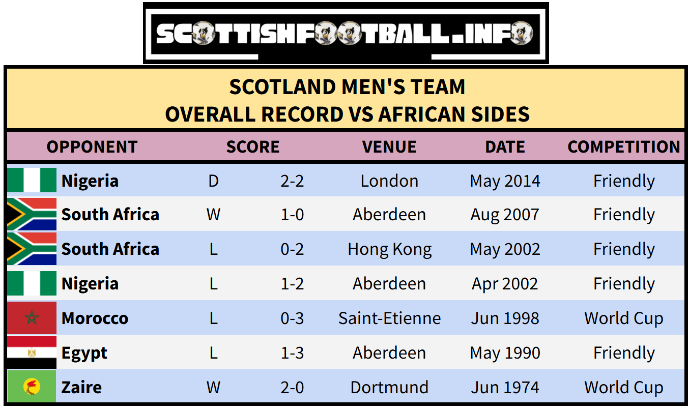 Scotland’s overall record against African nations is W2 D1 L4, with seven goals scored and 12 conceded. Their last such match was a 2-2 friendly draw with Nigeria in London in May 2014.