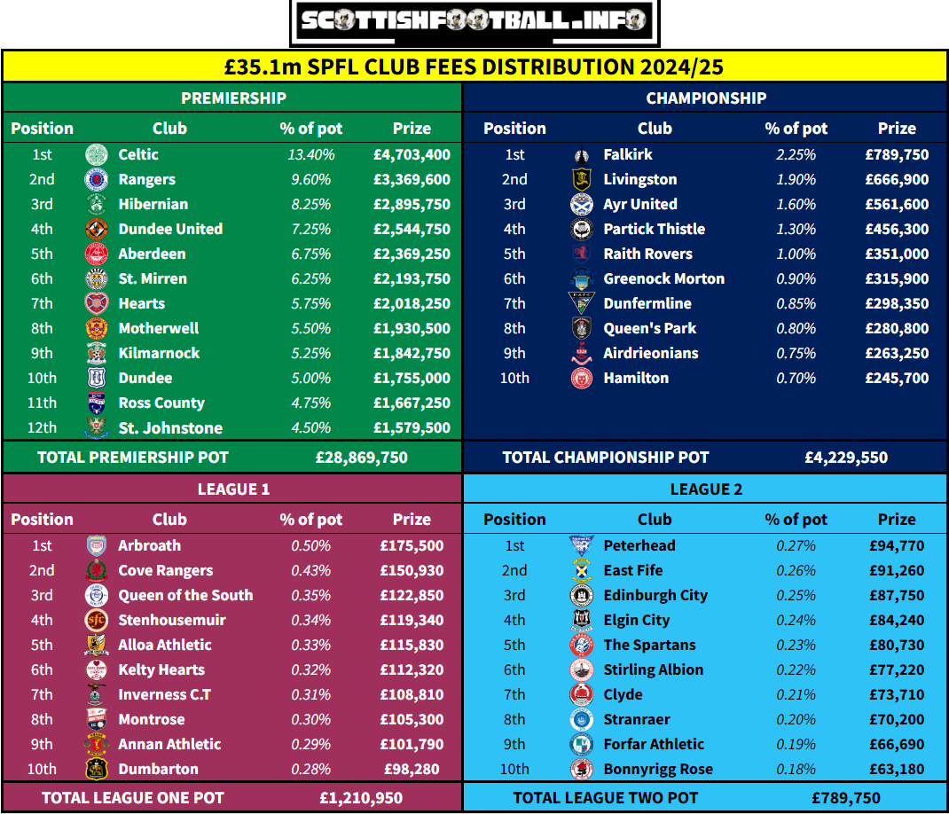 The 9th place finish in May of 2025 resulted in SPFL club fees of £1.8m - which matches my own calculations, a reductions from the nearly £2.5m they received the previous year after achieving a 4th place finish.