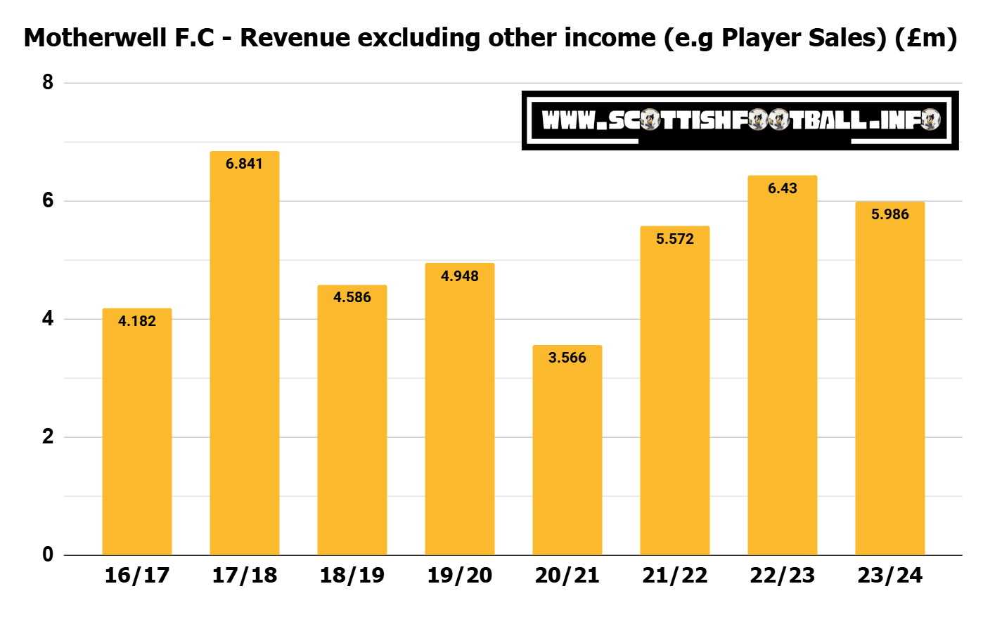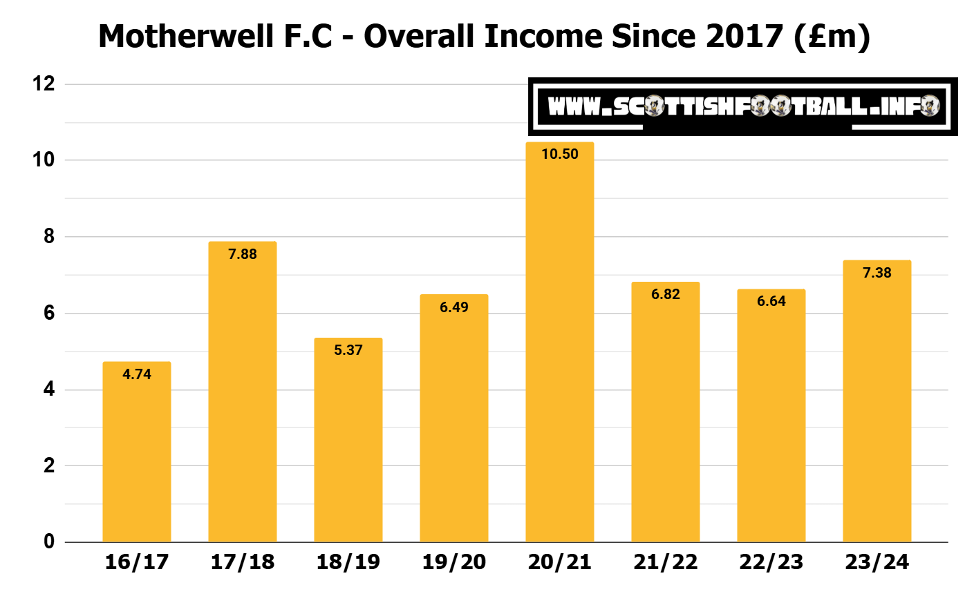 Motherwell’s “overall income” above includes both operating income and “other income,” which can distort the picture in this instance. For example, during the challenging behind-closed-doors 2020/21 season, the income figure was unusually high because it incorporated a £2.95m Covid loan from the government, a £2.29m business interruption insurance payment, and the club-record sale of David Turnbull to Celtic (£2.8m plus add-ons). Excluding these other items - such as profit on player sales or one-off insurance payments - provides a clearer view of Motherwell’s core income over the years: