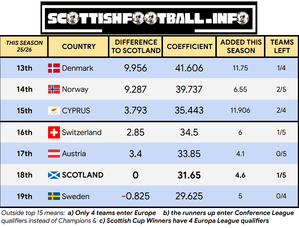 The rest of this article provides a detailed breakdown of the prize money and coefficient points earned by all Scottish clubs, as well as our place in this year’s UEFA rankings. I’ll also look ahead to next season, looking at the impact of Rangers’ Europa league final run dropping off our total.
