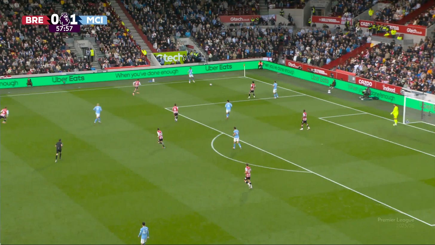Timing and distances are key here. Players need to be aware of how they angle their body and runs to cut off line breaking passes behind them. They also can’t be touch tight as they need to be able to collapse in and help teammates. You can see in the example above how similar the distances each Brentford player is keeping to each Man City player.