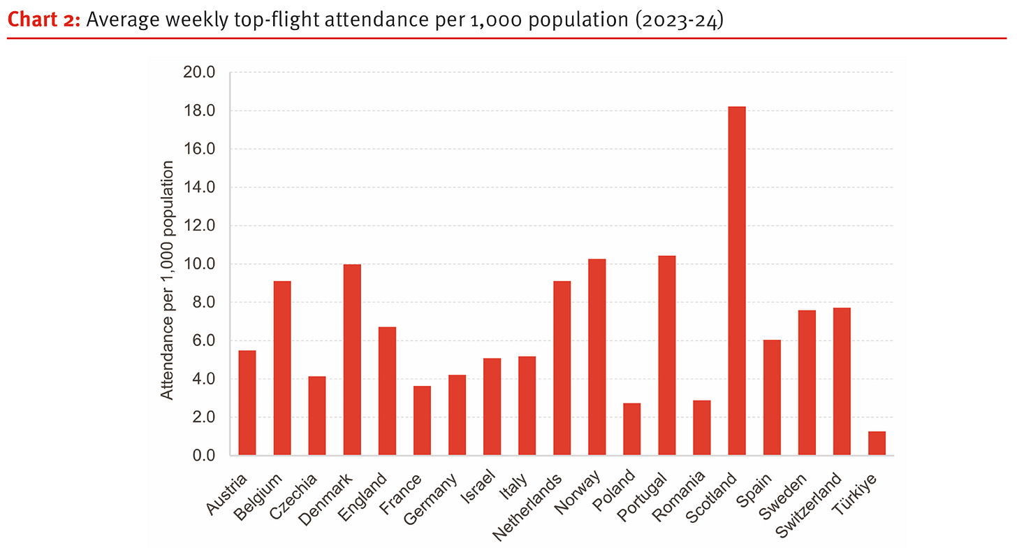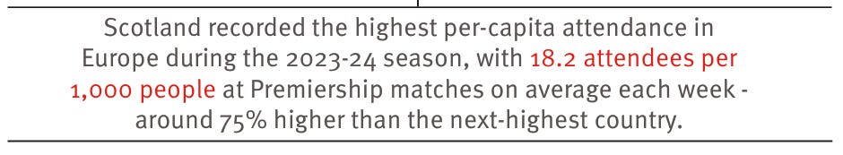 In collaboration with yours truly in September 2024, the SPFL reported how Scotland has by far the highest per-capita attendance of any top division in Europe, with about 18.2 attendees per 1,000 population each week (around 75% higher than the next closest country, Portugal):