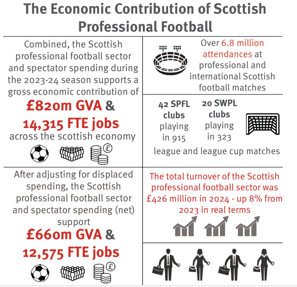The headline figure is an £820m gross economic contribution, supporting over 14,000 jobs in Scotland. As the season examined was 2023/24, the data is already two seasons out of date. However it’s still useful for highlighting just how important our national game is - not just from a social perspective - but from an attempt to quantify the economic importance. While earlier studies of this nature often focused only on the men’s SPFL, this FAI report takes a comprehensive view of Scottish football - covering men’s and women’s leagues and cups, plus international and European matches.
