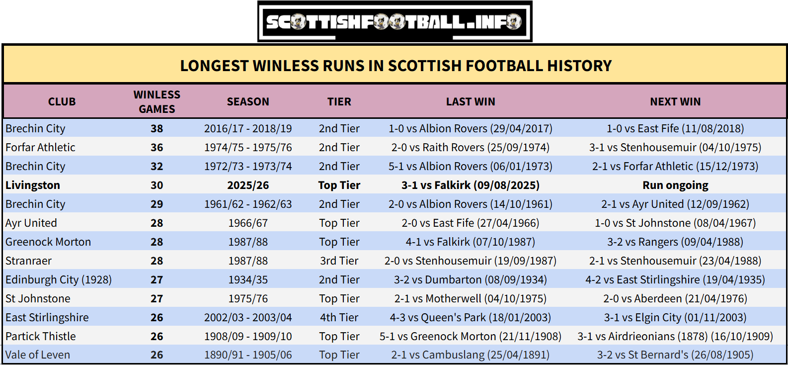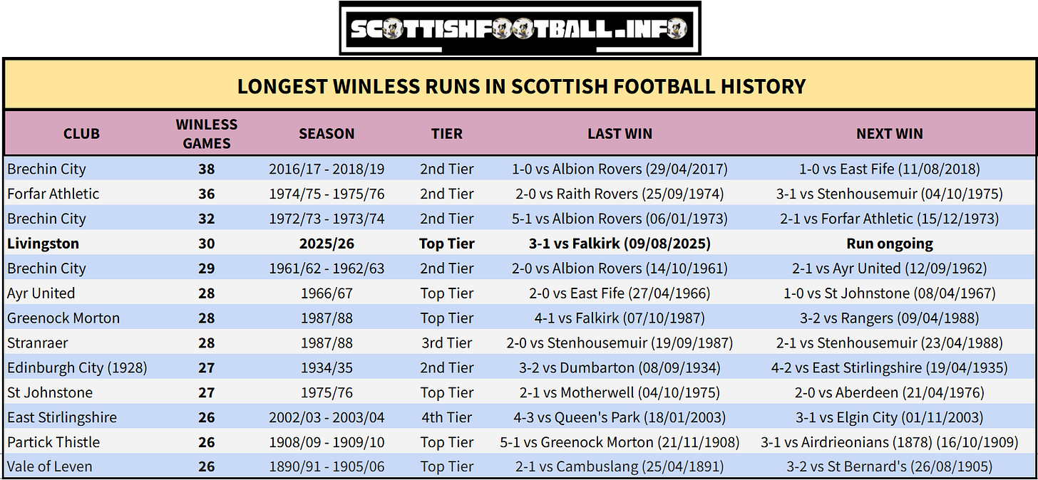 Livingston are on the longest winless run in top-flight history, now without a win in 31 league matches and in any of their 17 away league matches.