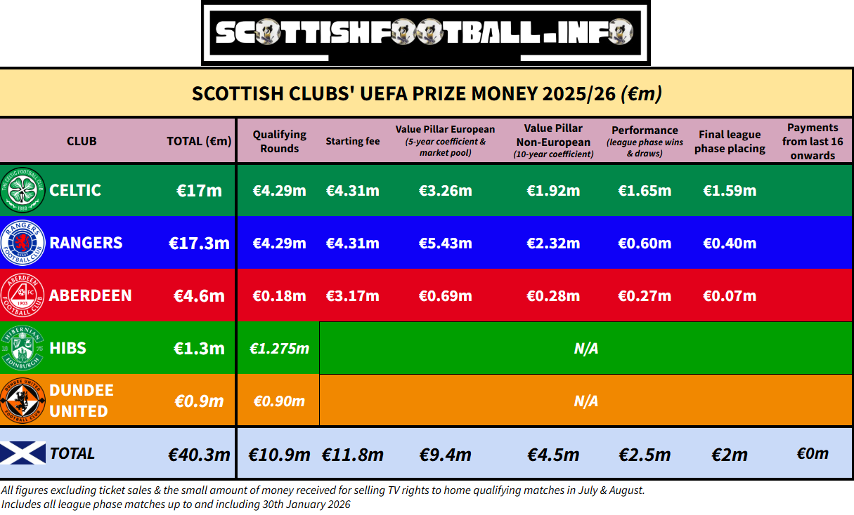 Aberdeen and Rangers are unfortunately out and so cannot add to their pot, but Celtic face VfB Stuttgart in a tricky knockout round tie - where progression would add another €1.75m to their total.