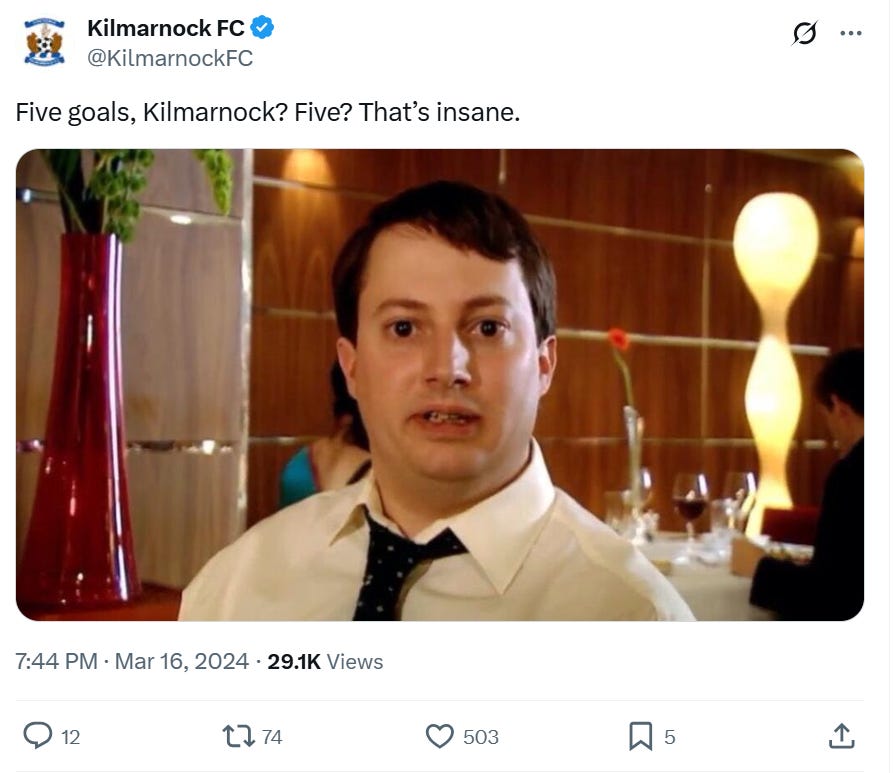 St. Mirren had their revenge on Kilmarnock F.C - and their fantastic admin on X.com - after Killie had posted the below meme after defeating St. Mirren 5-2 12 months ago:
