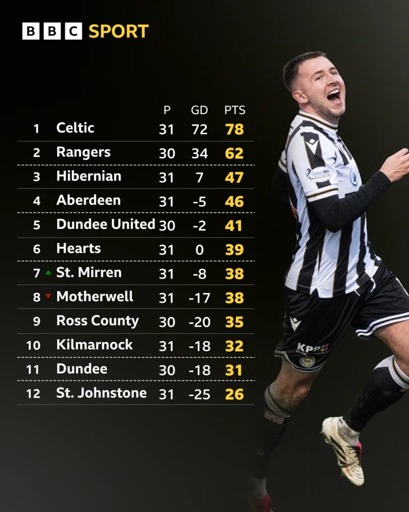 St. Mirren are making a real surge for the top six - they are up to 7th and only one point behind Hearts. They travel to Dundee next weekend before ending at home to Ross County, fixtures that give St. Mirren a real opportunity of an unprecedented third consecutive season finishing in the top 6.